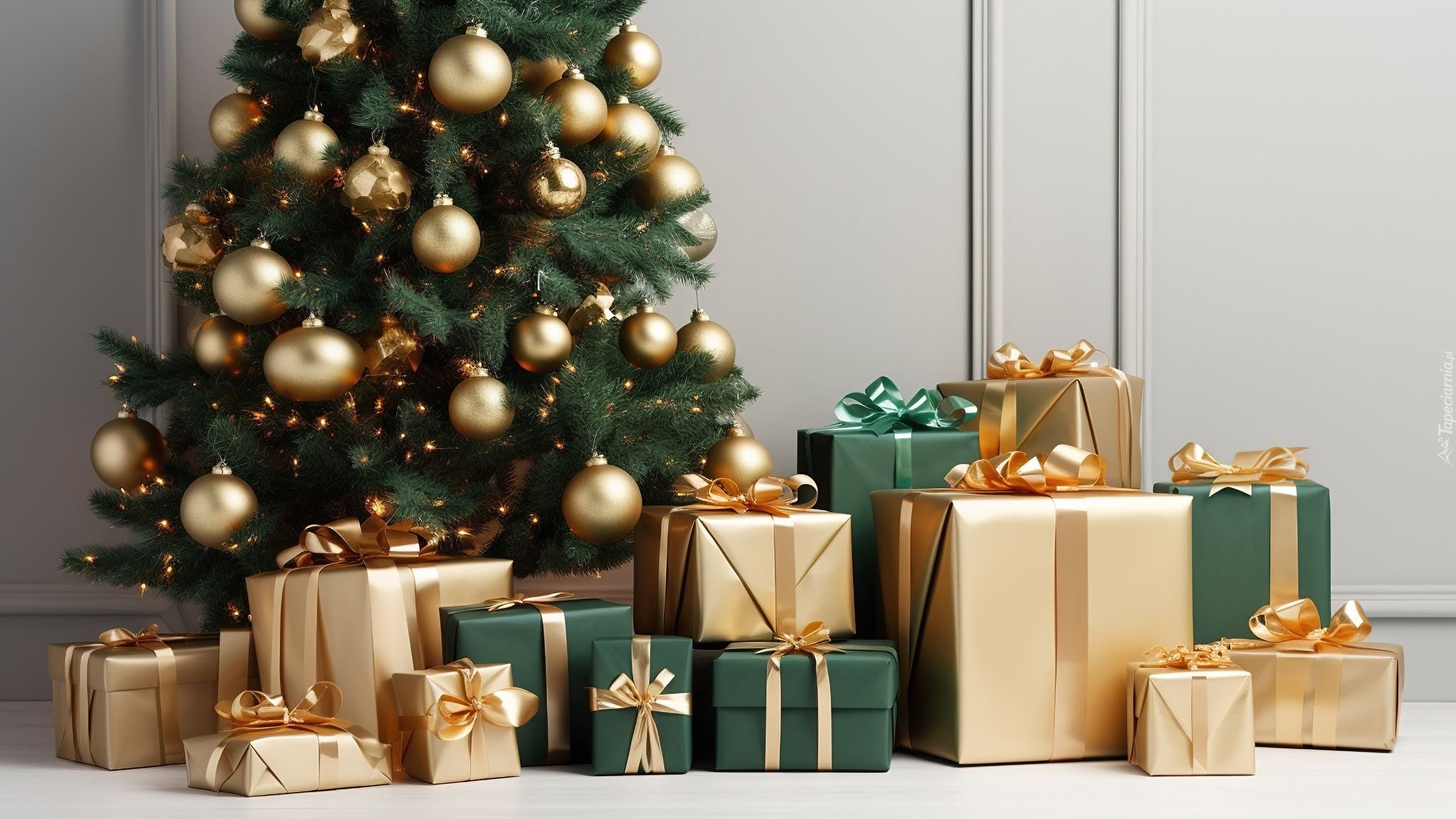 Edytor tapety: Kolorowe prezenty pod choinką ze złotymi bombkami