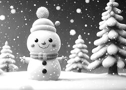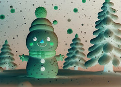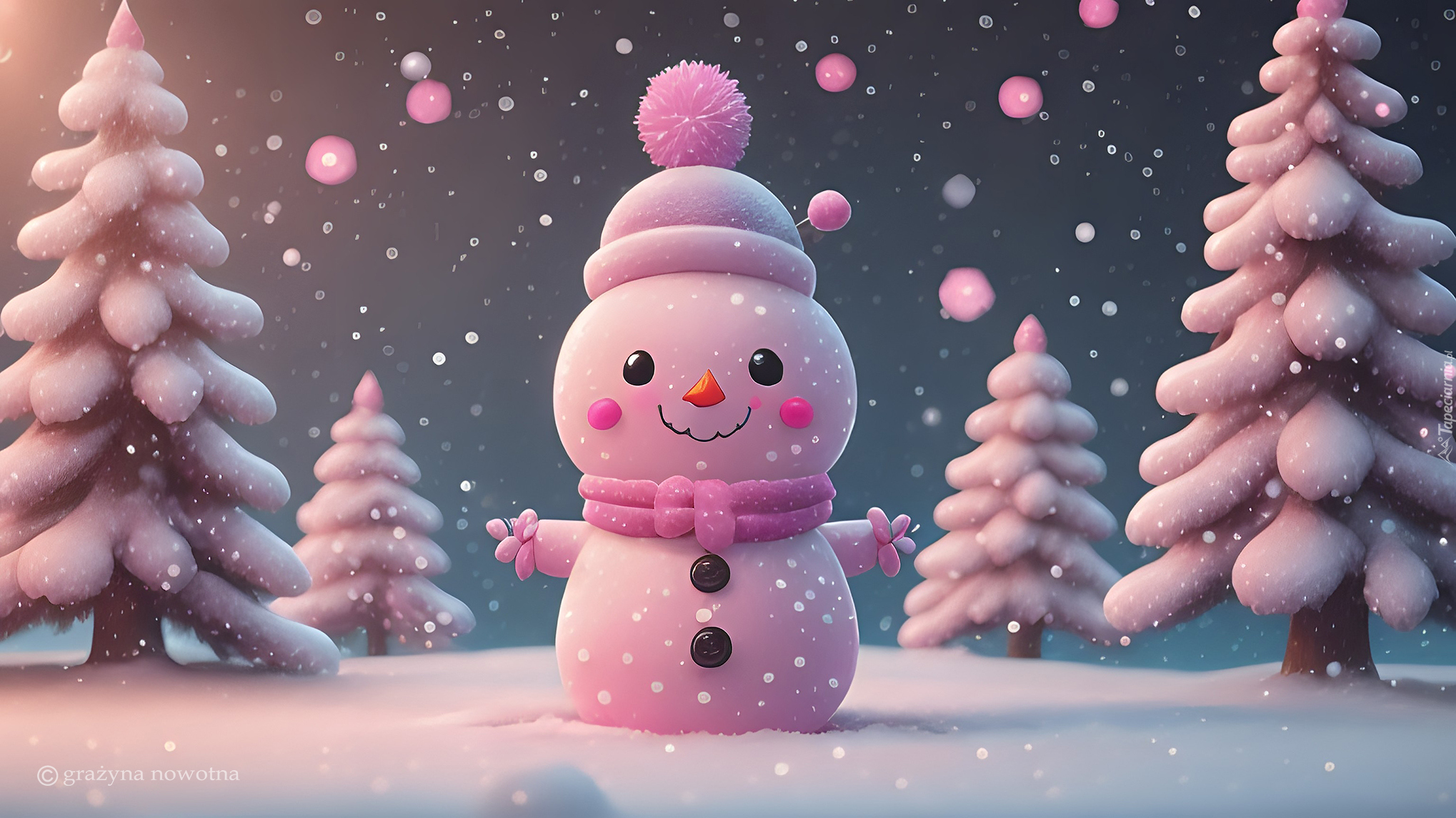 Edytor tapety: Różowy bałwanek na śniegu wśród choinek