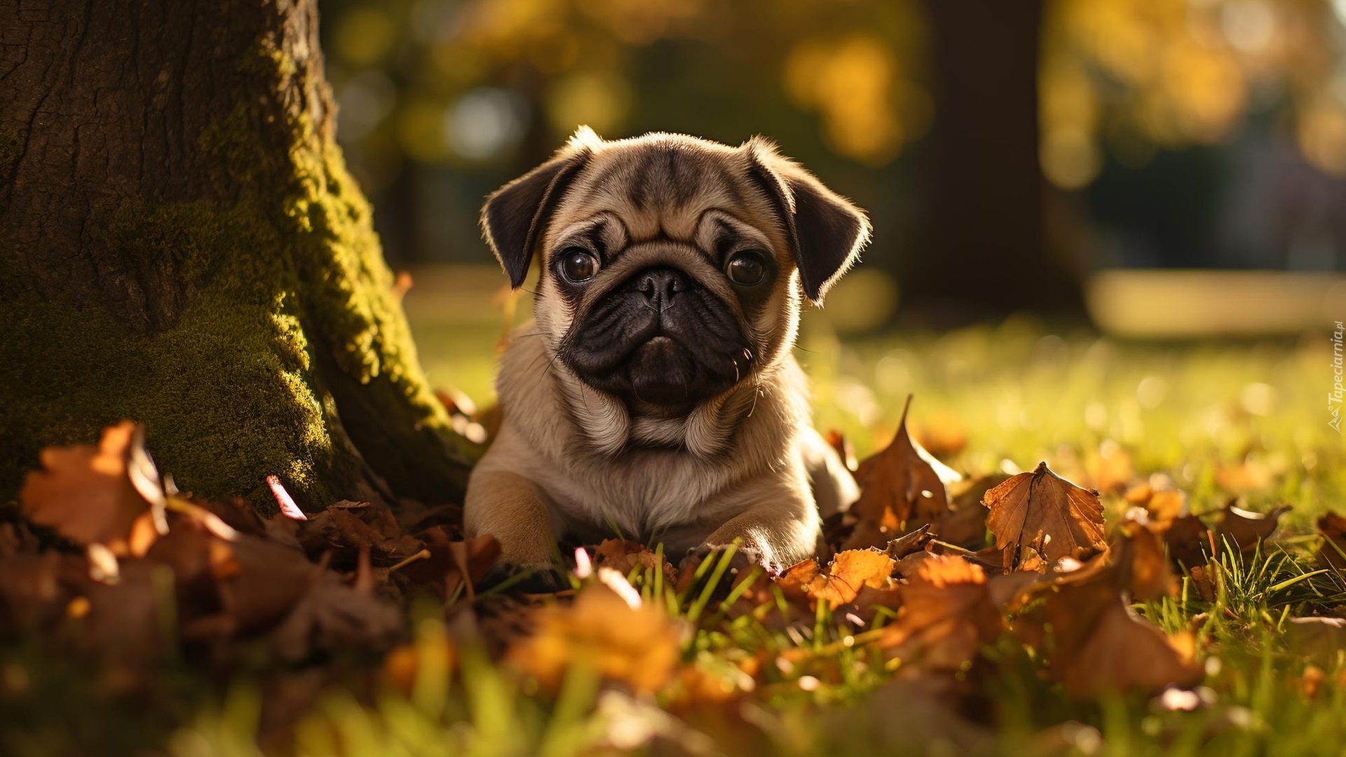 Edytor tapety: Mops leżący wśród liści obok drzewa
