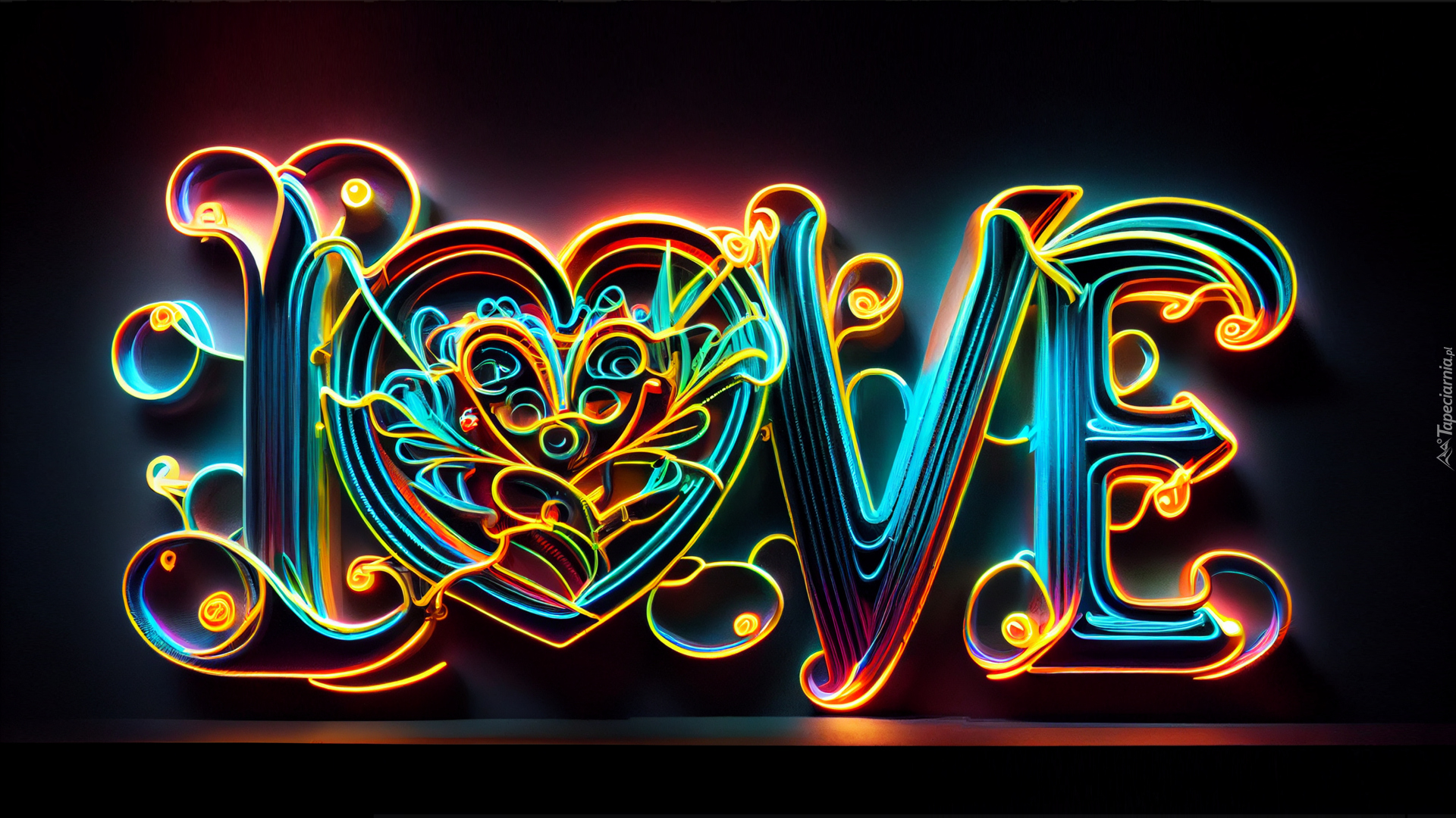 Edytor tapety: Neonowy napis Love z sercem na czarnym tle