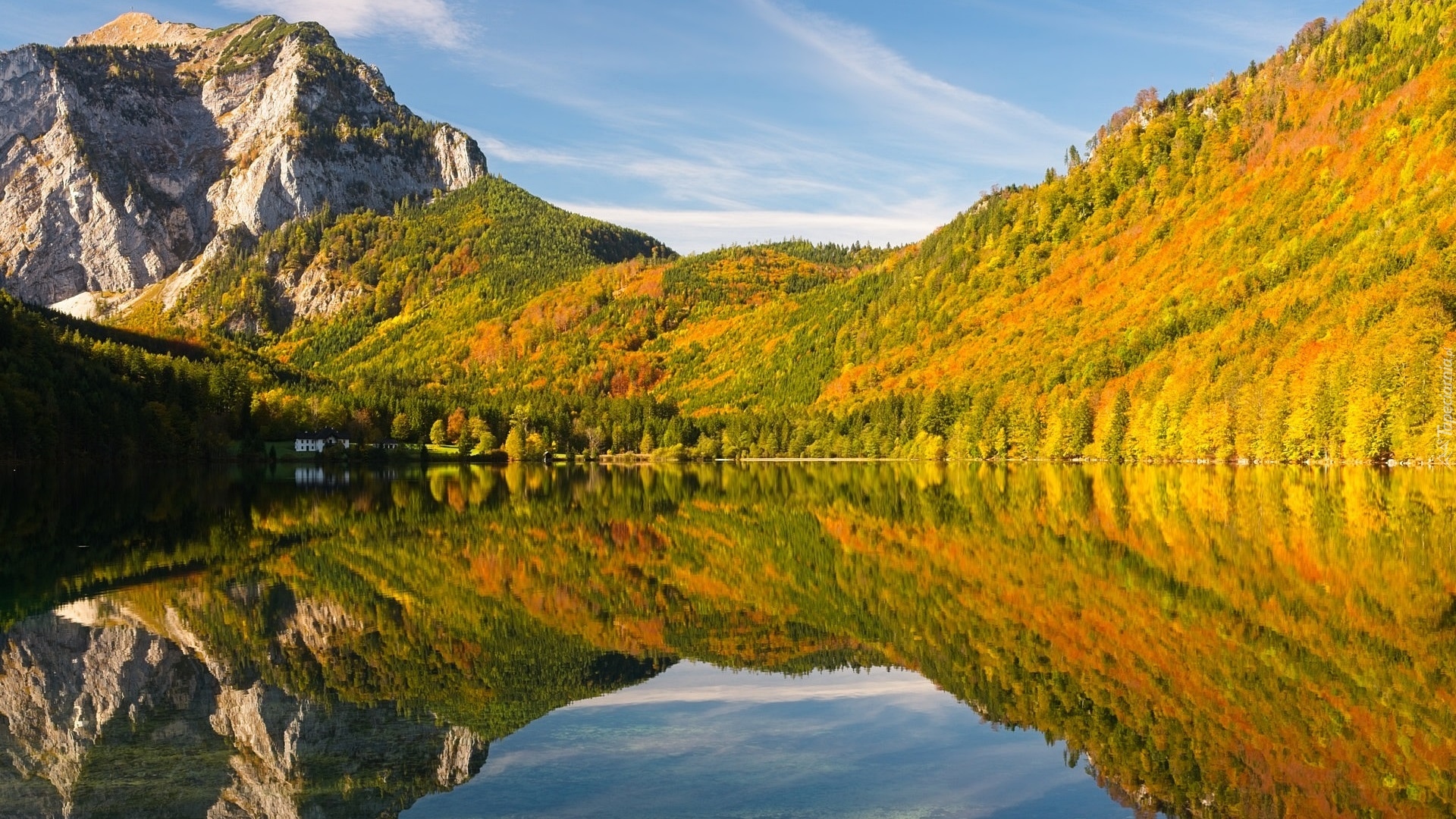 Edytor tapety: Rozświetlone zalesione góry nad jeziorem Langbathseen w Austrii