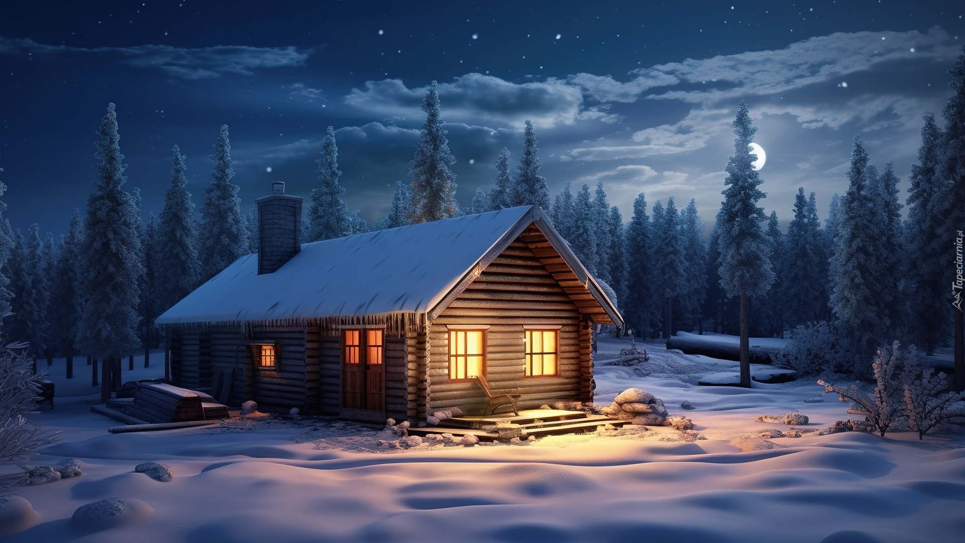 Edytor tapety: Oświetlony wewnątrz dom w zimowym lesie nocą