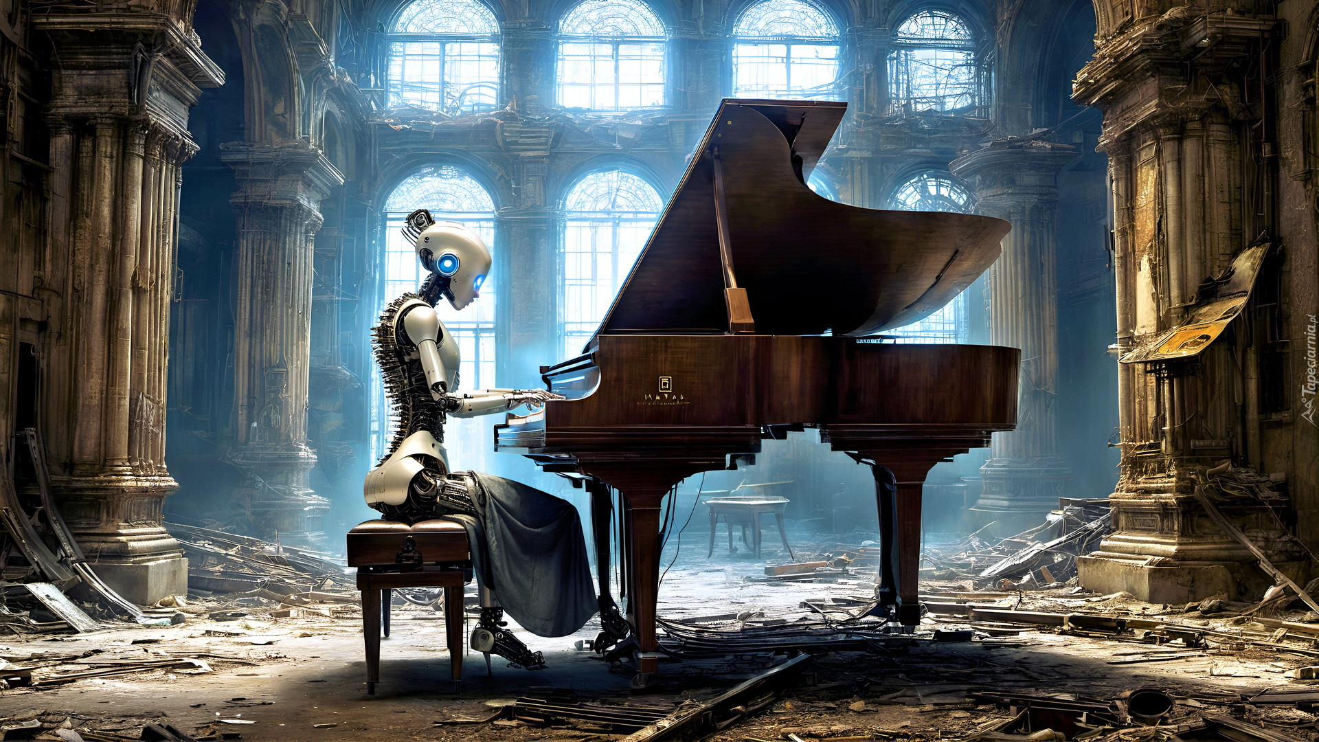 Edytor tapety: Kobieta robot grająca na fortepianie w zniszczonym domu