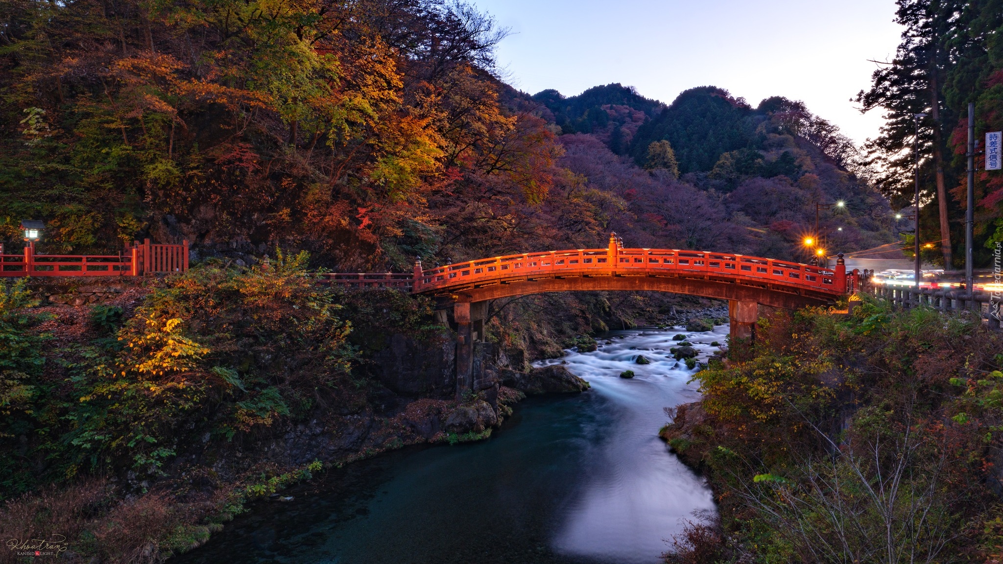 Edytor tapety: Czerwony most Shinkyo nad rzeką Daiya w Japonii