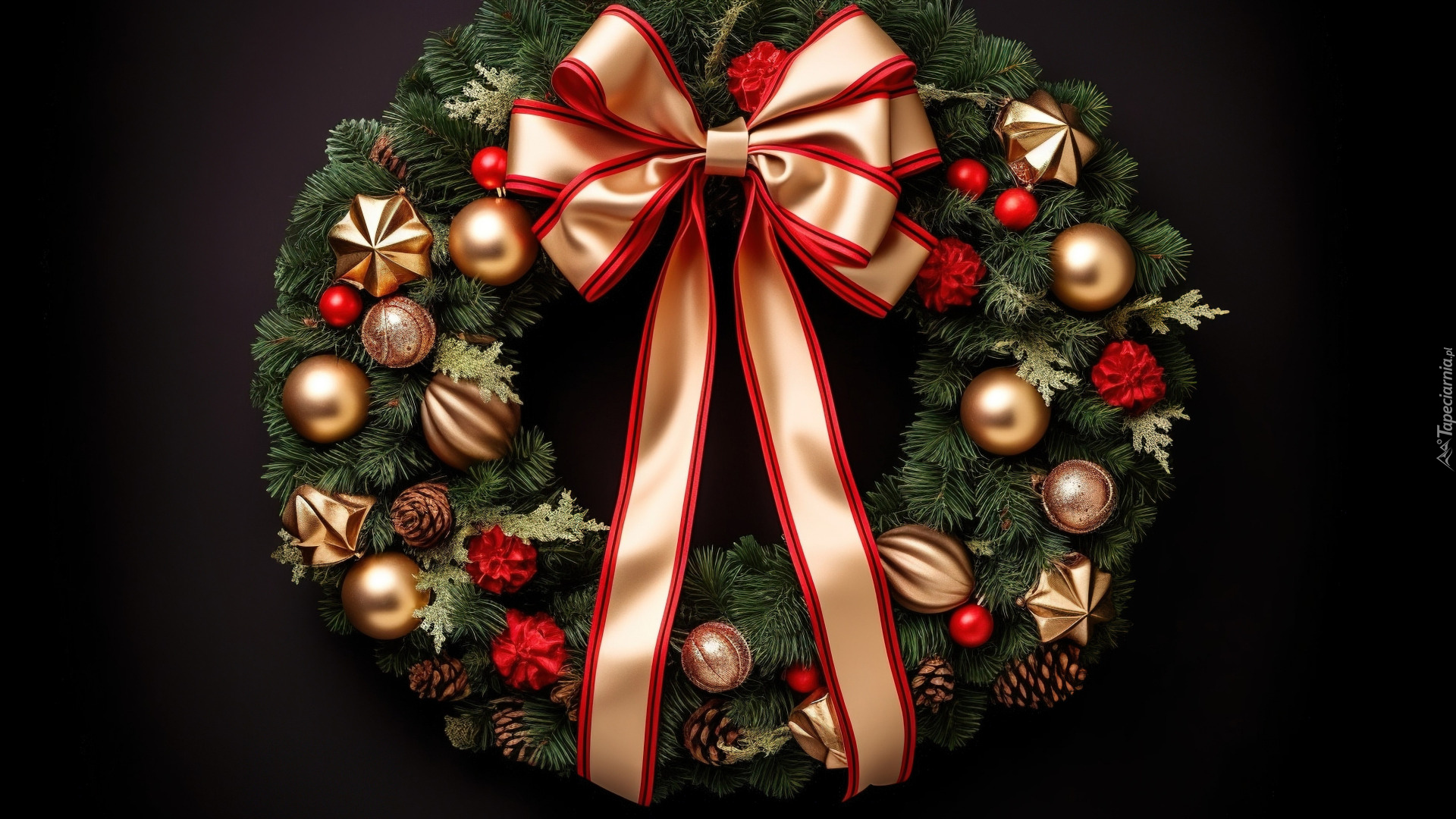 Edytor tapety: Świąteczny wieniec z kolorowymi bombkami i kokardą