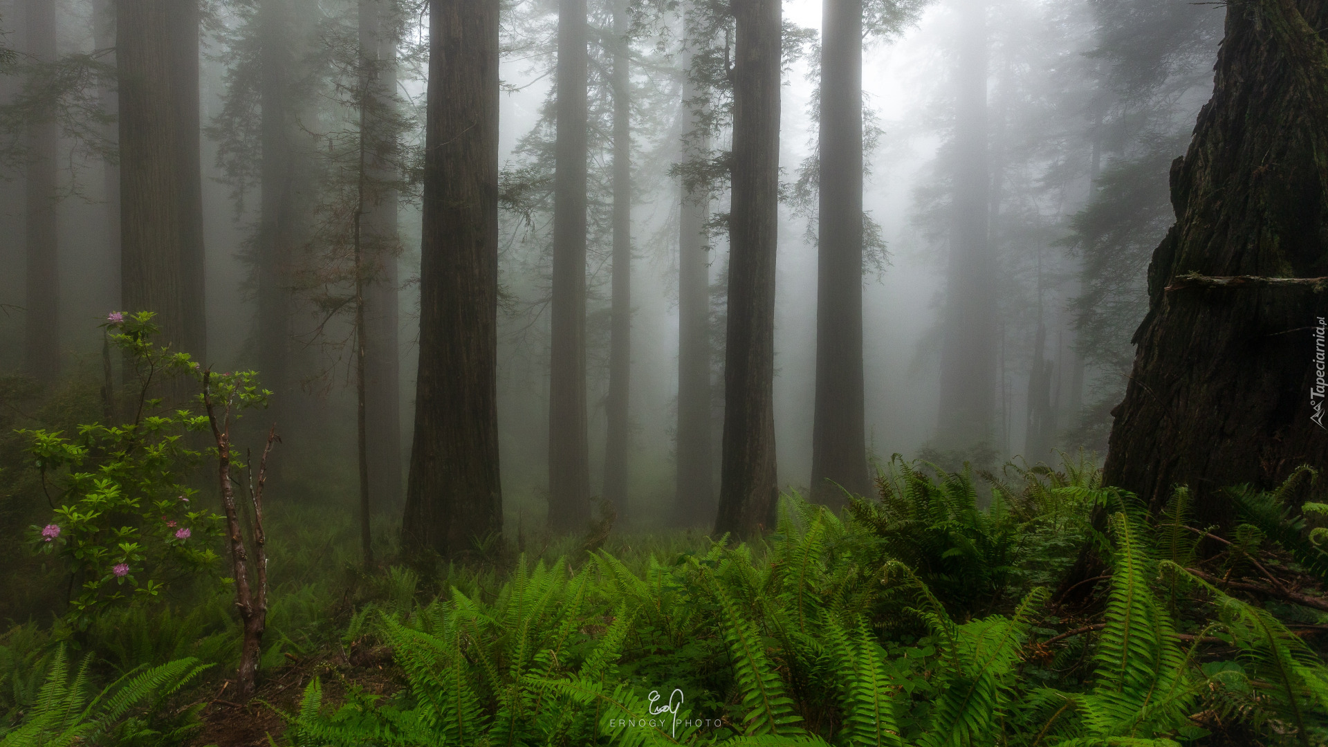 Edytor tapety: Paprocie pod wysokimi drzewami w zamglonym lesie