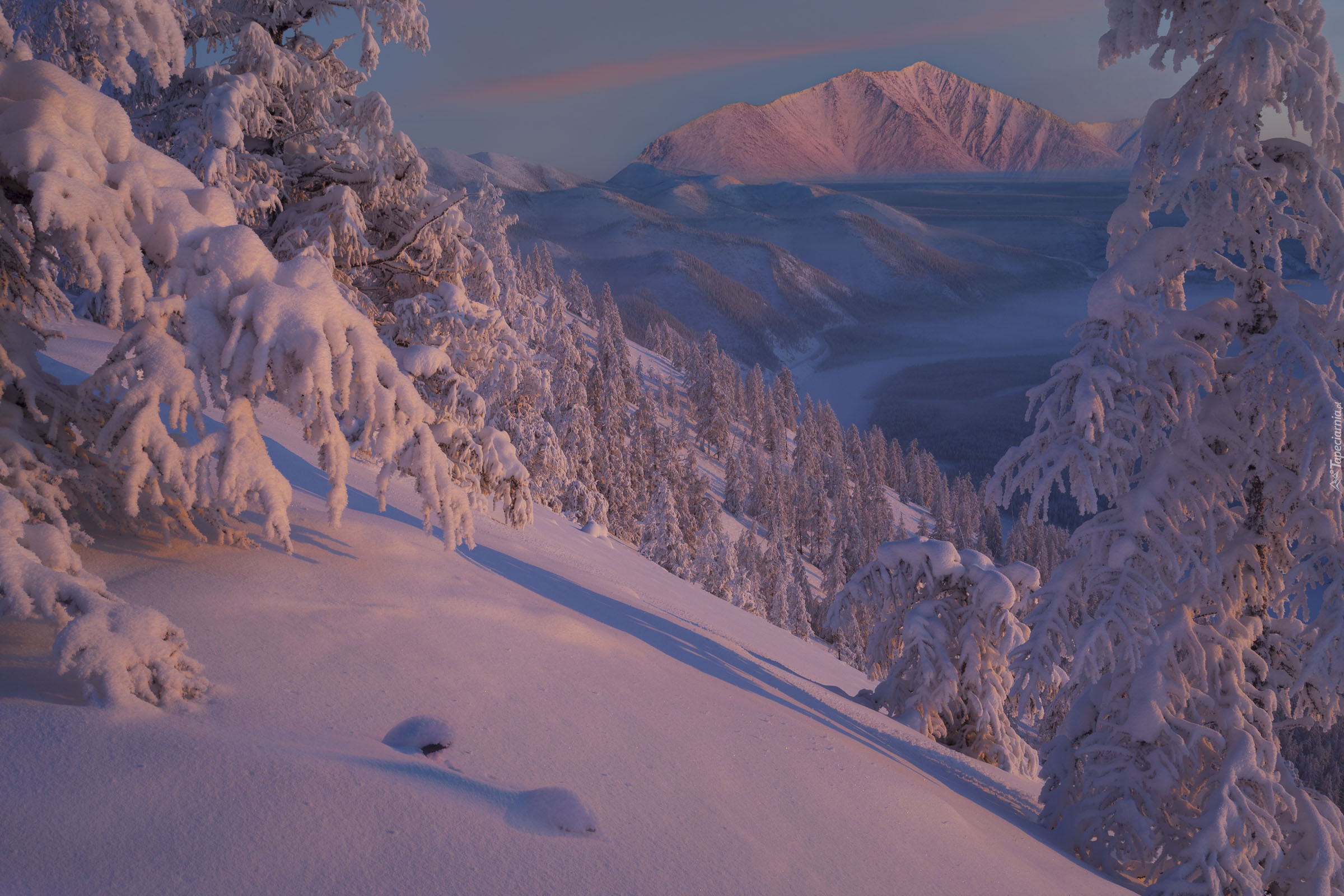 Edytor tapety: Ośnieżone drzewa w zimowych górach