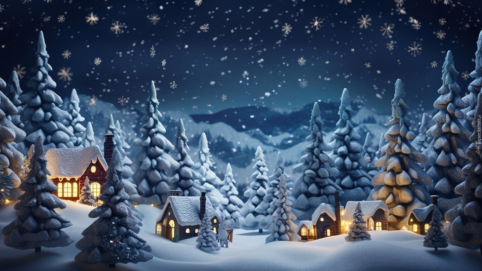 Edytor tapety: Oświetlone domki pomiędzy ośnieżonymi drzewami