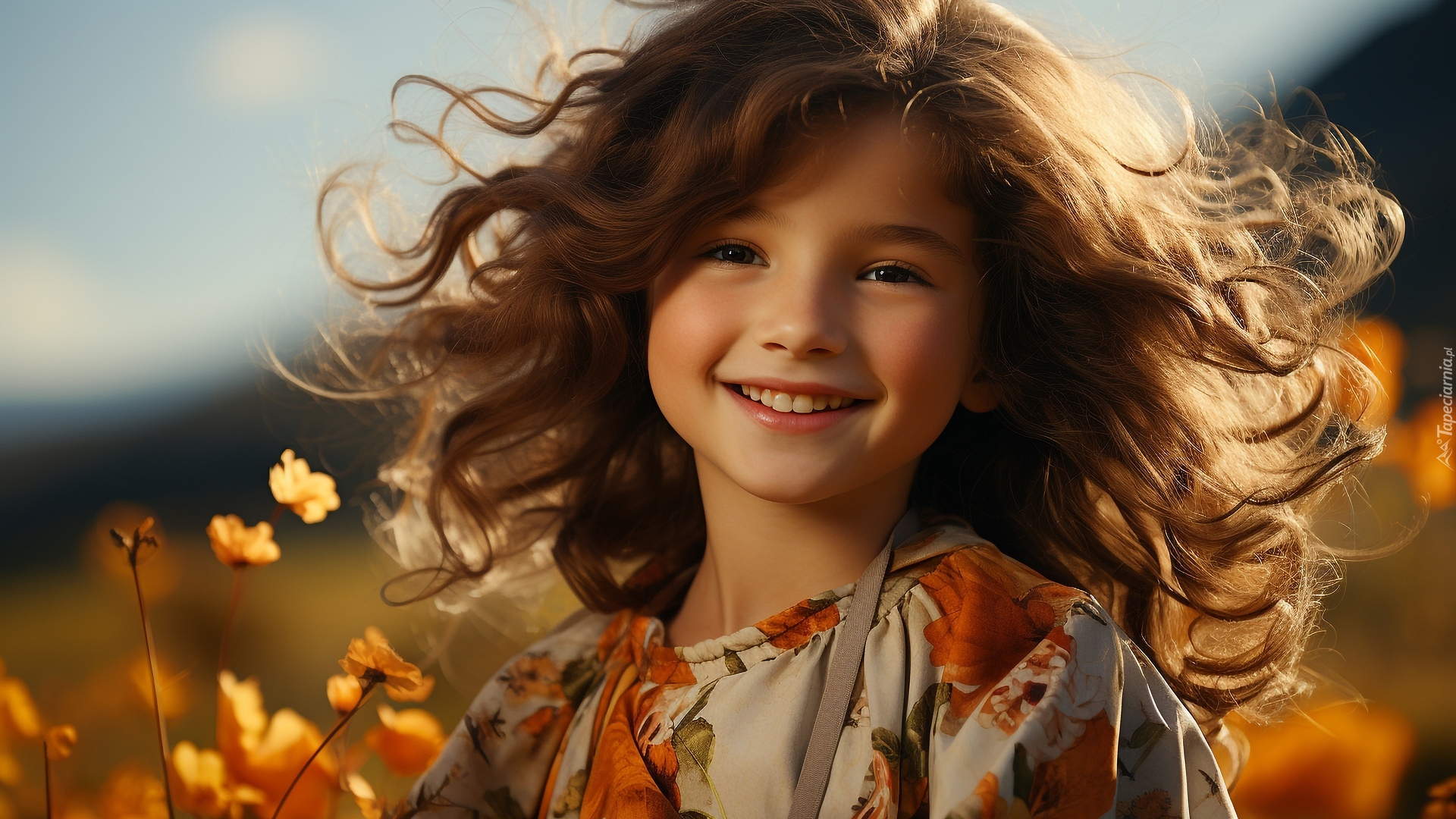 Edytor tapety: Uśmiechnięta dziewczynka z rozwianymi włosami na łące