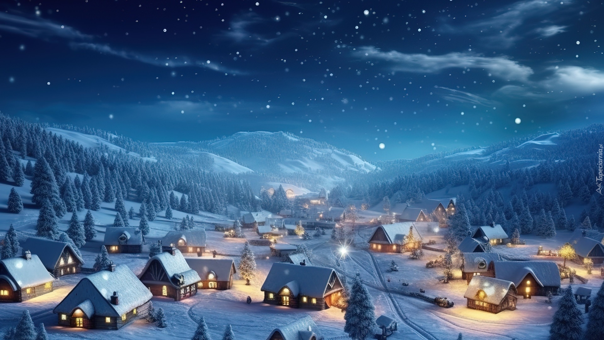 Edytor tapety: Oświetlone nocą domy w górskiej dolinie zimową porą