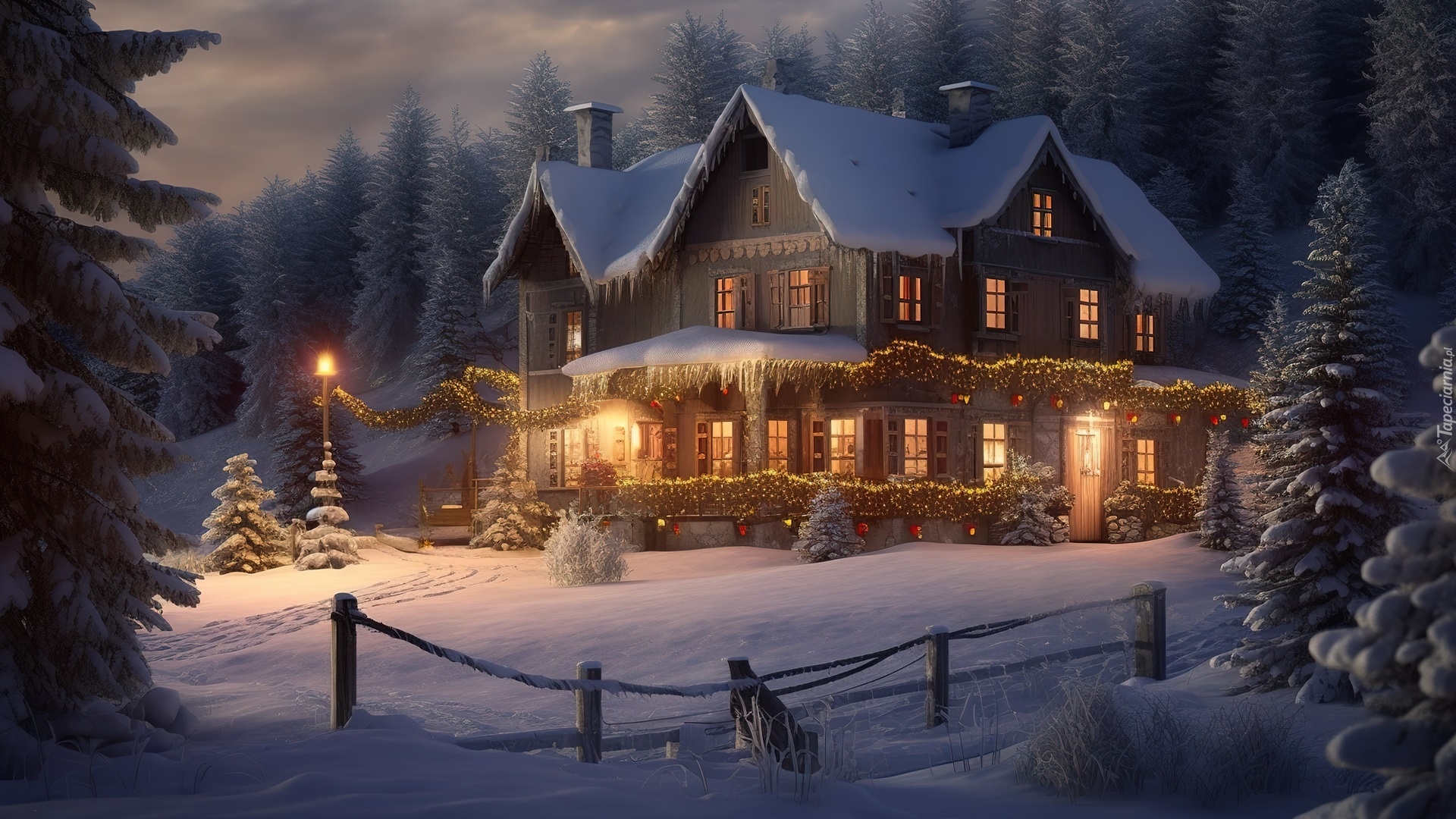 Edytor tapety: Udekorowany na Święta ośnieżony dom w zimowym lesie