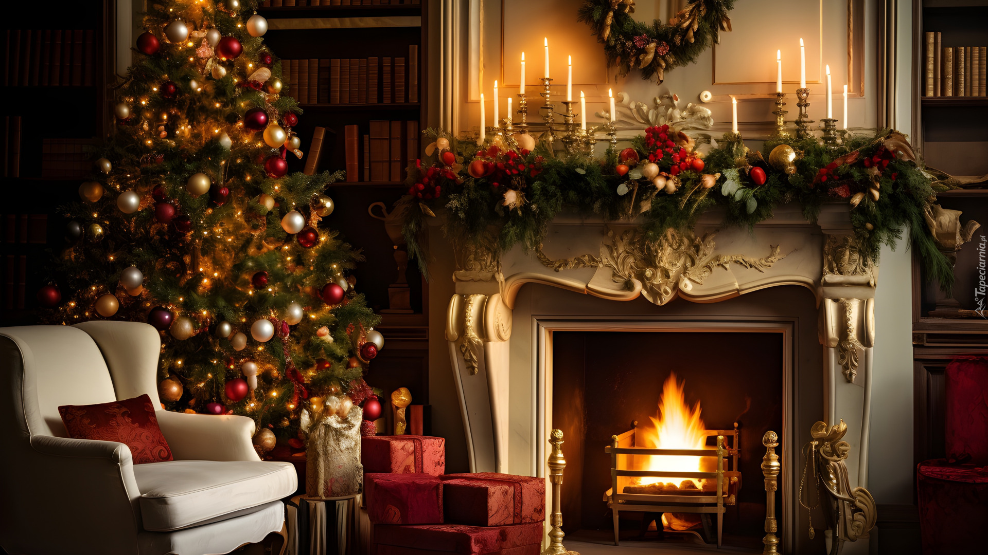 Edytor tapety: Świece na udekorowanym kominku i prezenty pod choinką