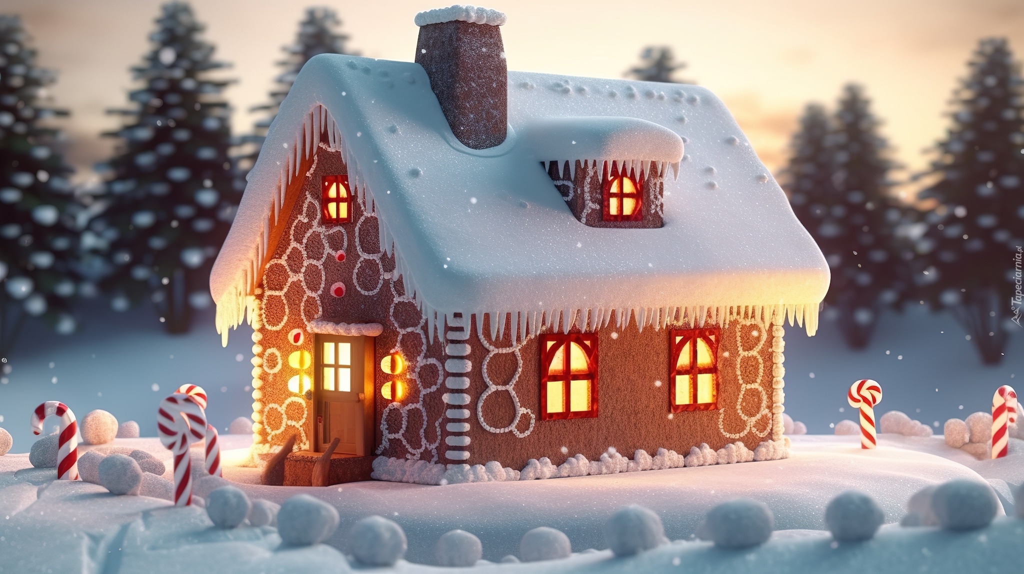 Edytor tapety: Ośnieżony i oświetlony domek w grafice