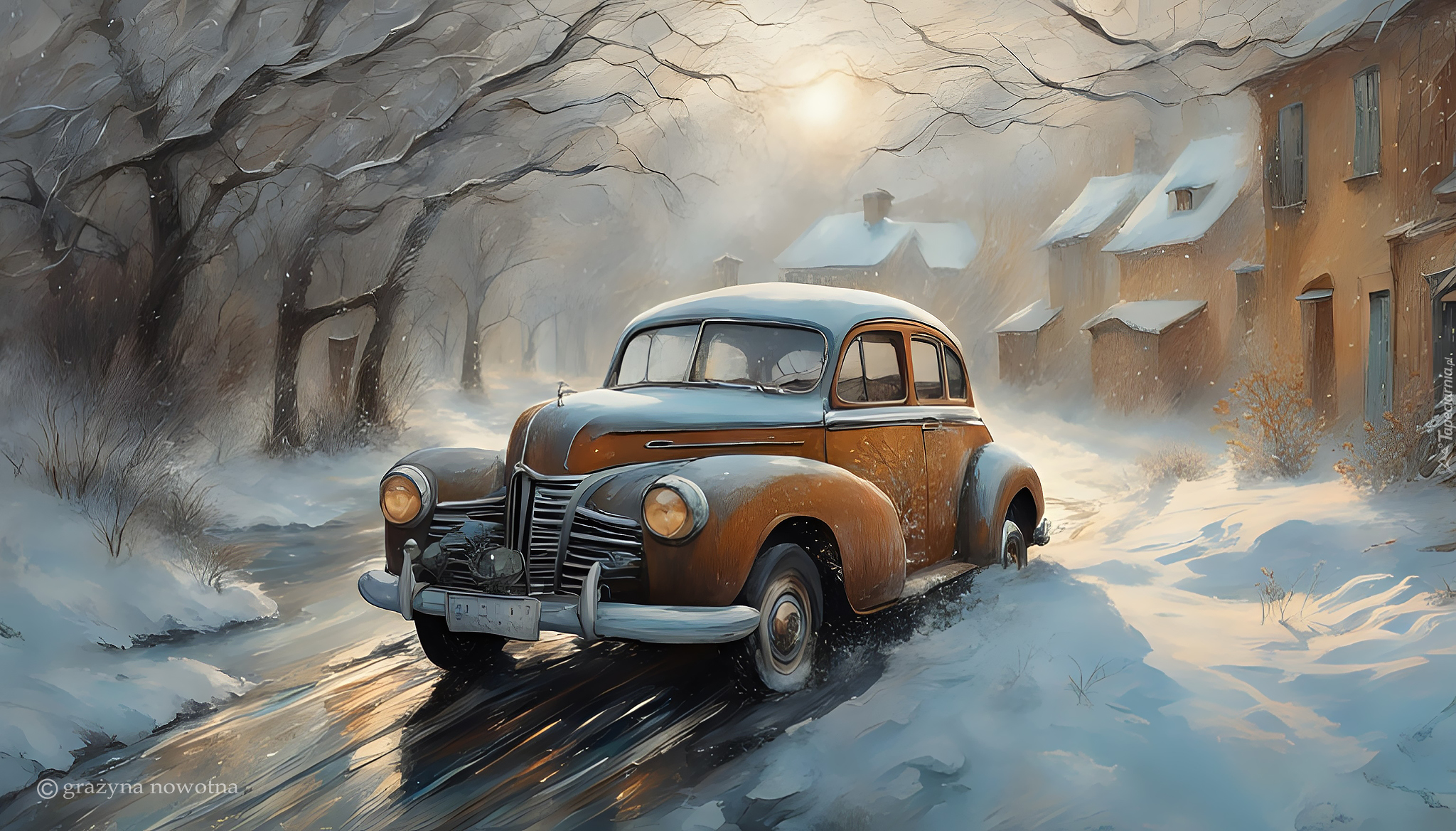 Edytor tapety: Zabytkowy samochód na zaśnieżonej ulicy