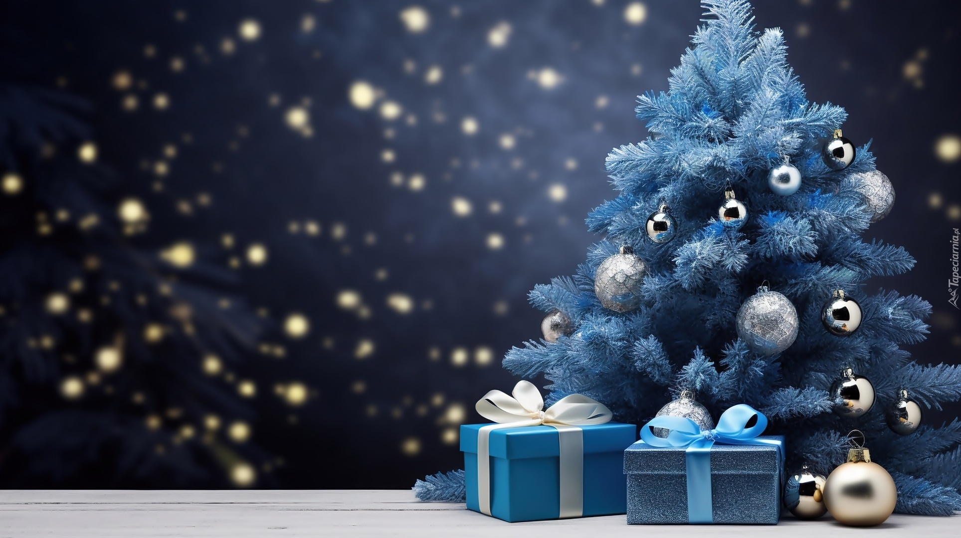 Edytor tapety: Niebieskie pudełka z prezentami pod niebieską choinką