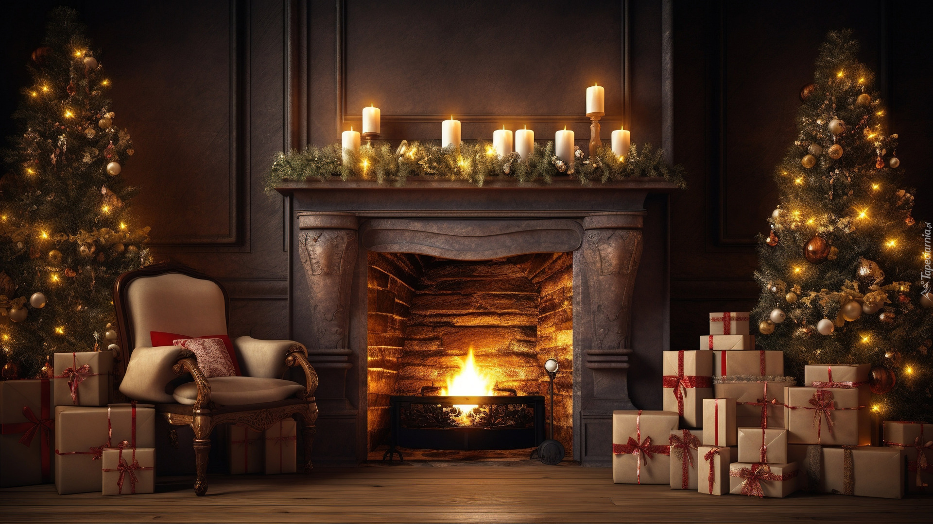 Edytor tapety: Prezenty pod choinkami i fotel przy kominku