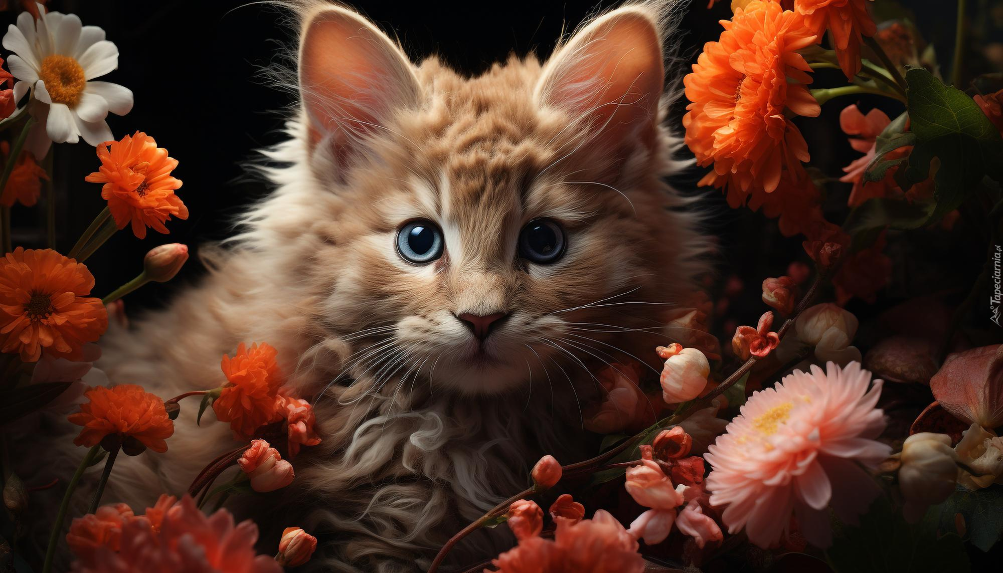 Edytor tapety: Rudawy niebieskooki kot wśród kwiatów