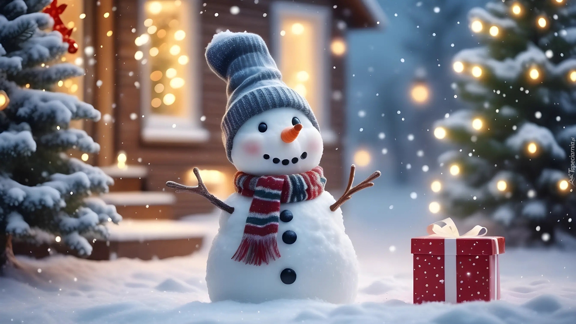 Edytor tapety: Bałwanek przed domem obok prezentu