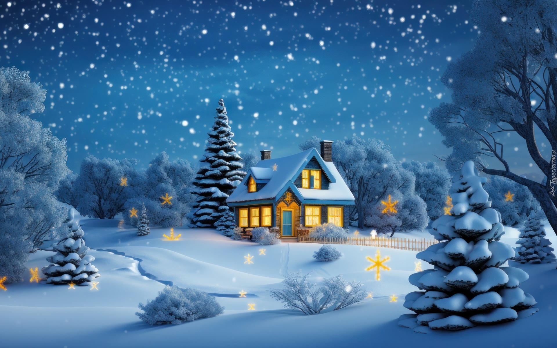 Edytor tapety: Rozświetlony dom i ośnieżone drzewa w padającym śniegu