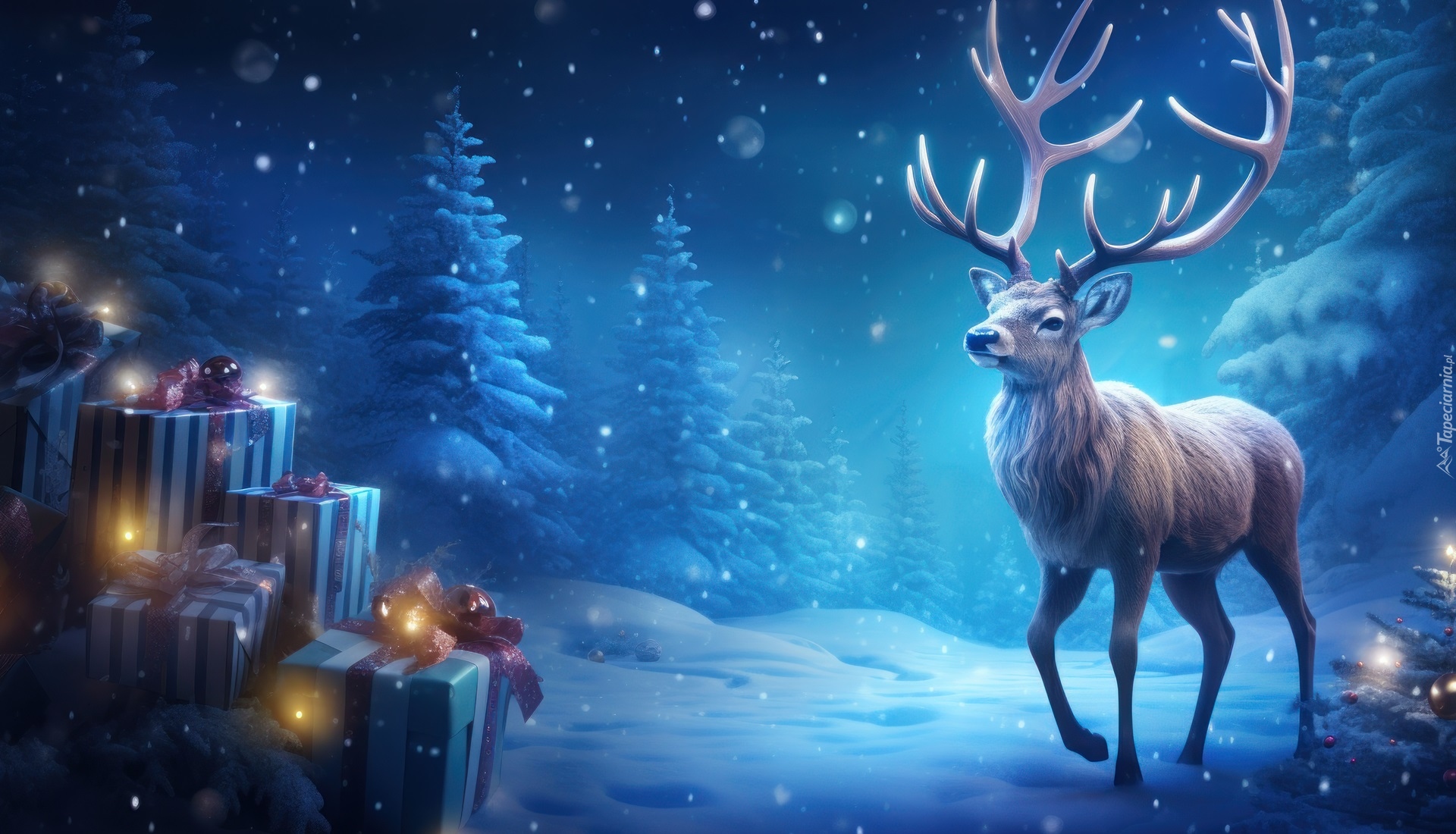Edytor tapety: Renifer i pudełka z prezentami