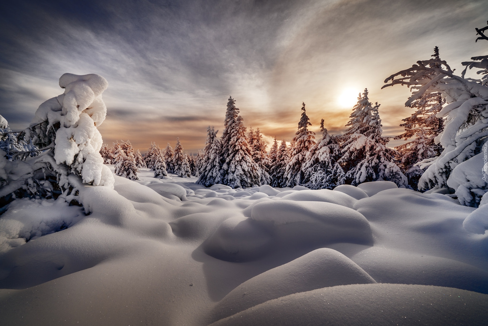 Edytor tapety: Ośnieżone drzewa w zaspach o wschodzie słońca