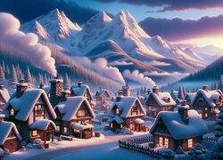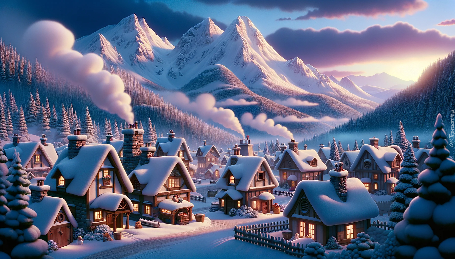 Edytor tapety: Zasypana śniegiem wioska w górskiej dolinie