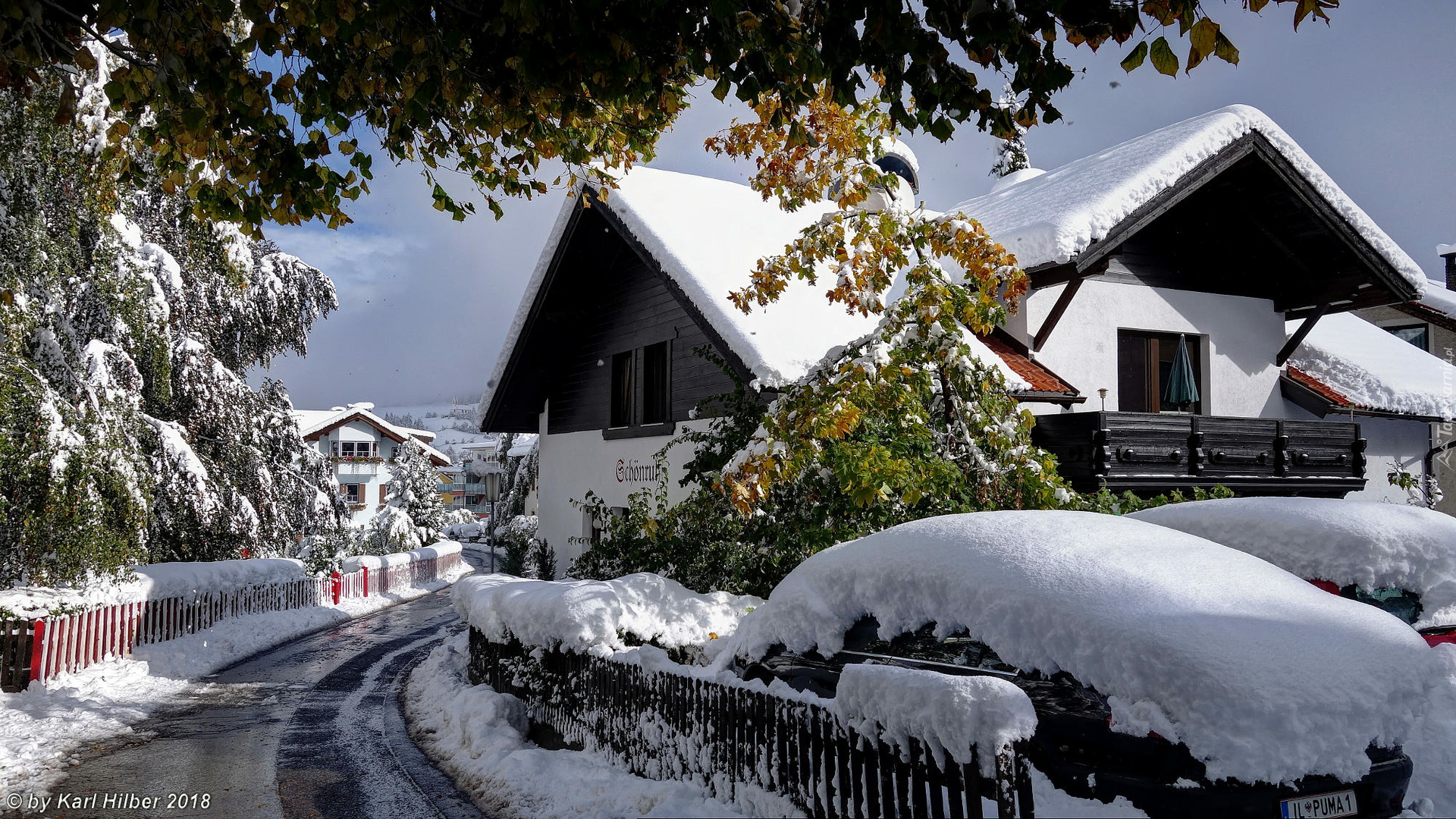 Edytor tapety: Droga i ogrodzenie przy ośnieżonych domach