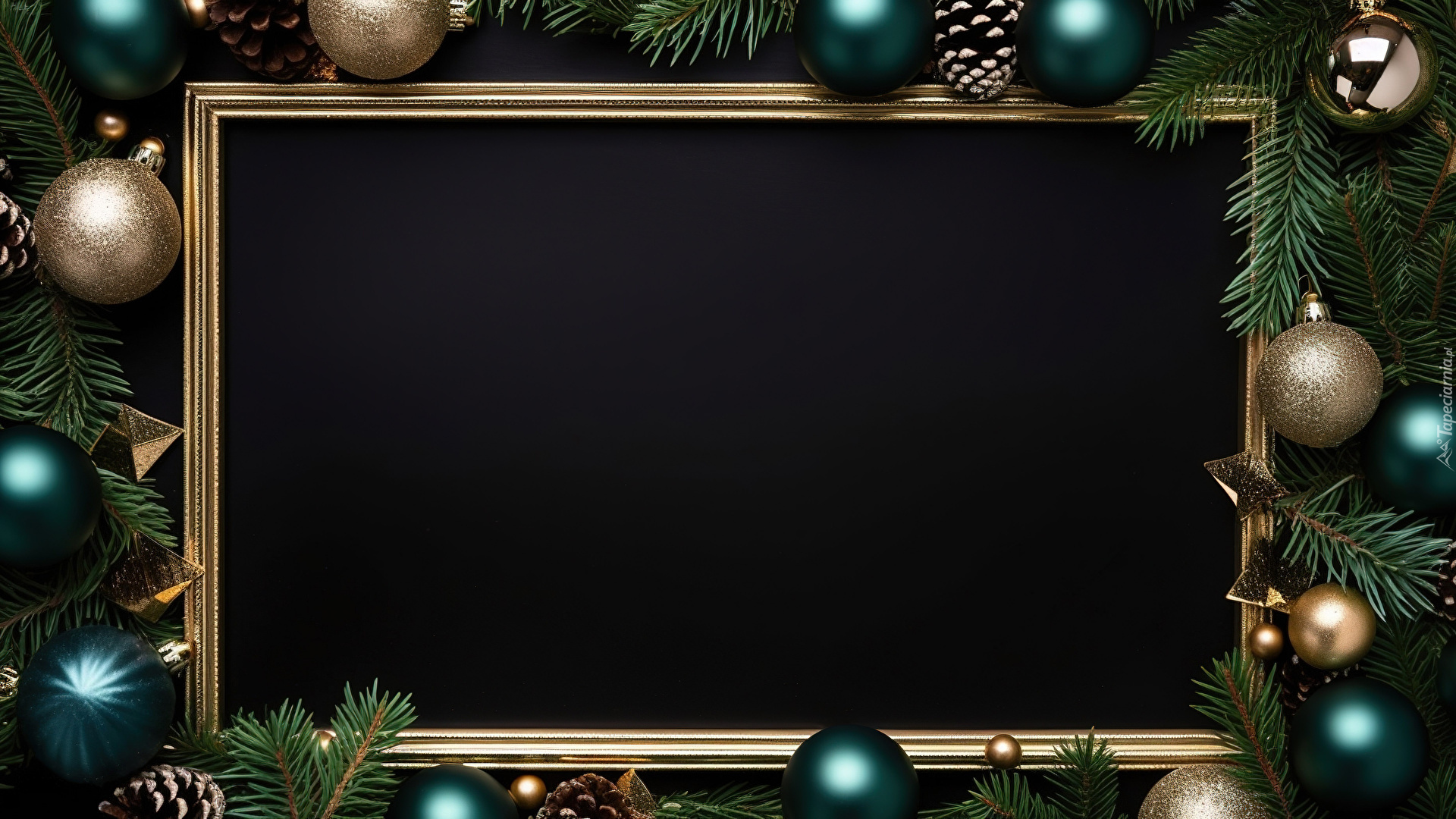 Edytor tapety: Bombki i gałązki obok złotej ramki