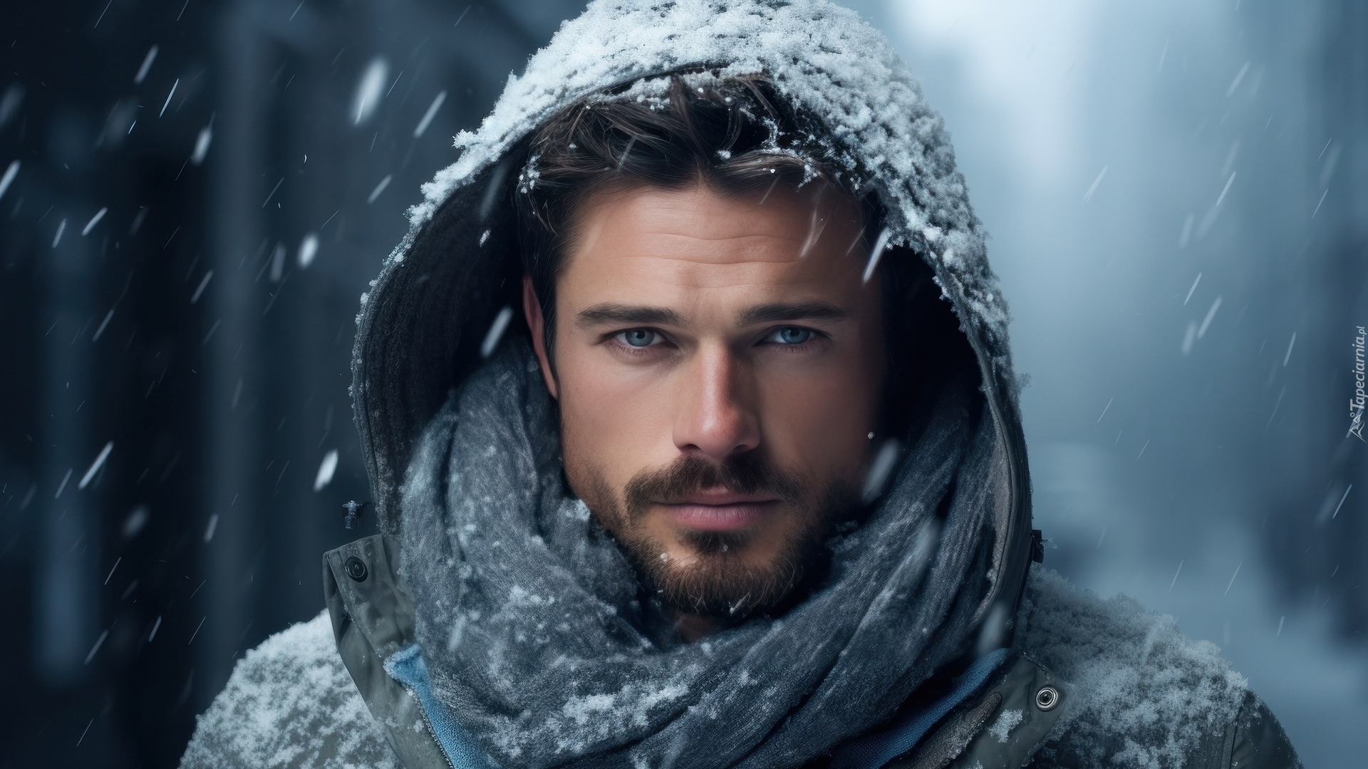 Edytor tapety: Mężczyzna otulony szalem w kapturze