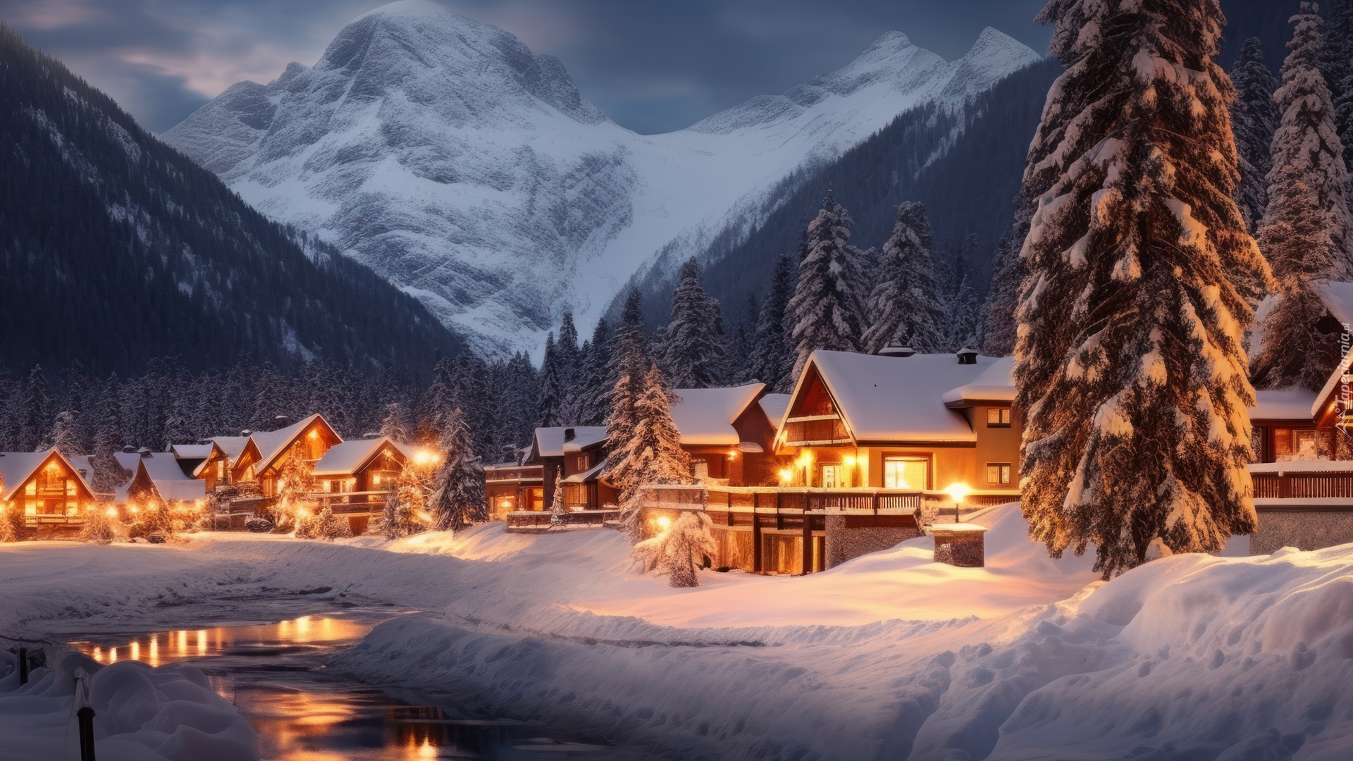 Edytor tapety: Oświetlone nocą domy w zimowych górach