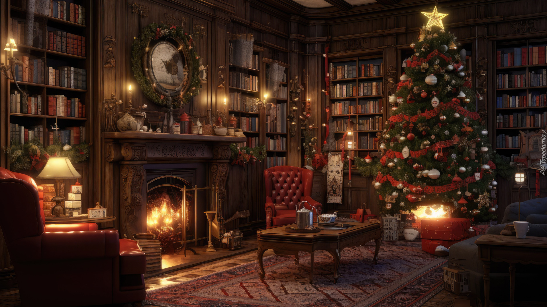 Edytor tapety: Choinka i kominek w pokoju pełnym książek