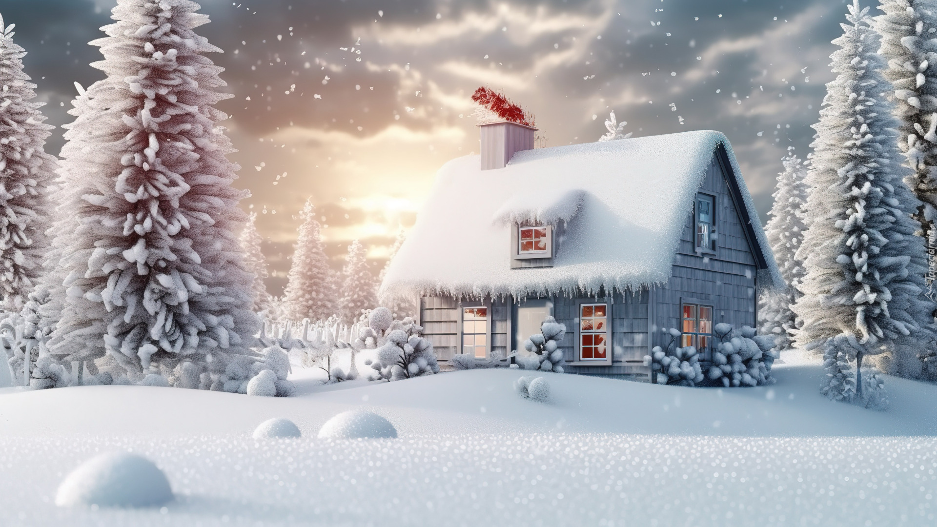 Edytor tapety: Ośnieżony domek i drzewa w zaspach