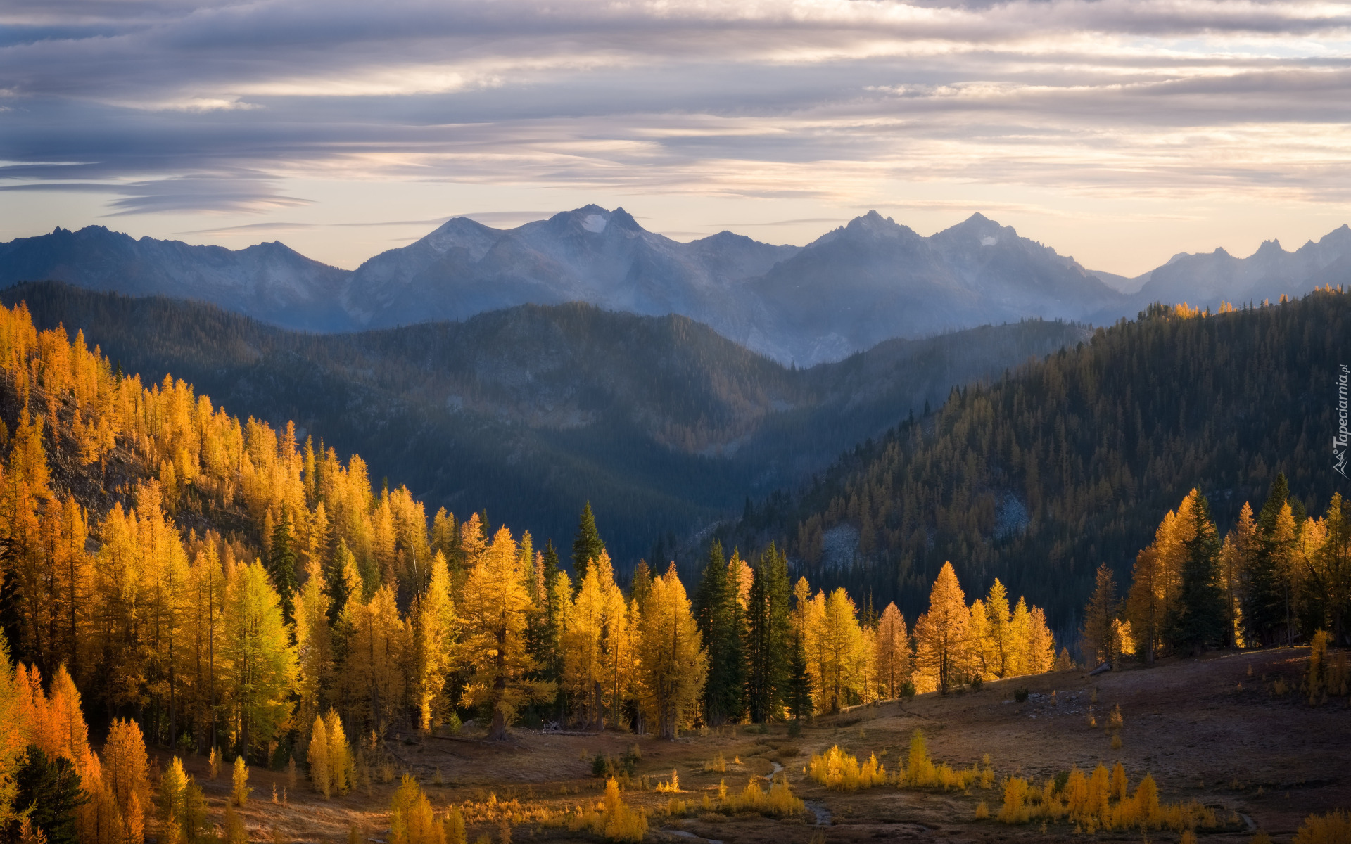 Edytor tapety: Pożółkłe drzewa na tle zamglonych gór jesienią
