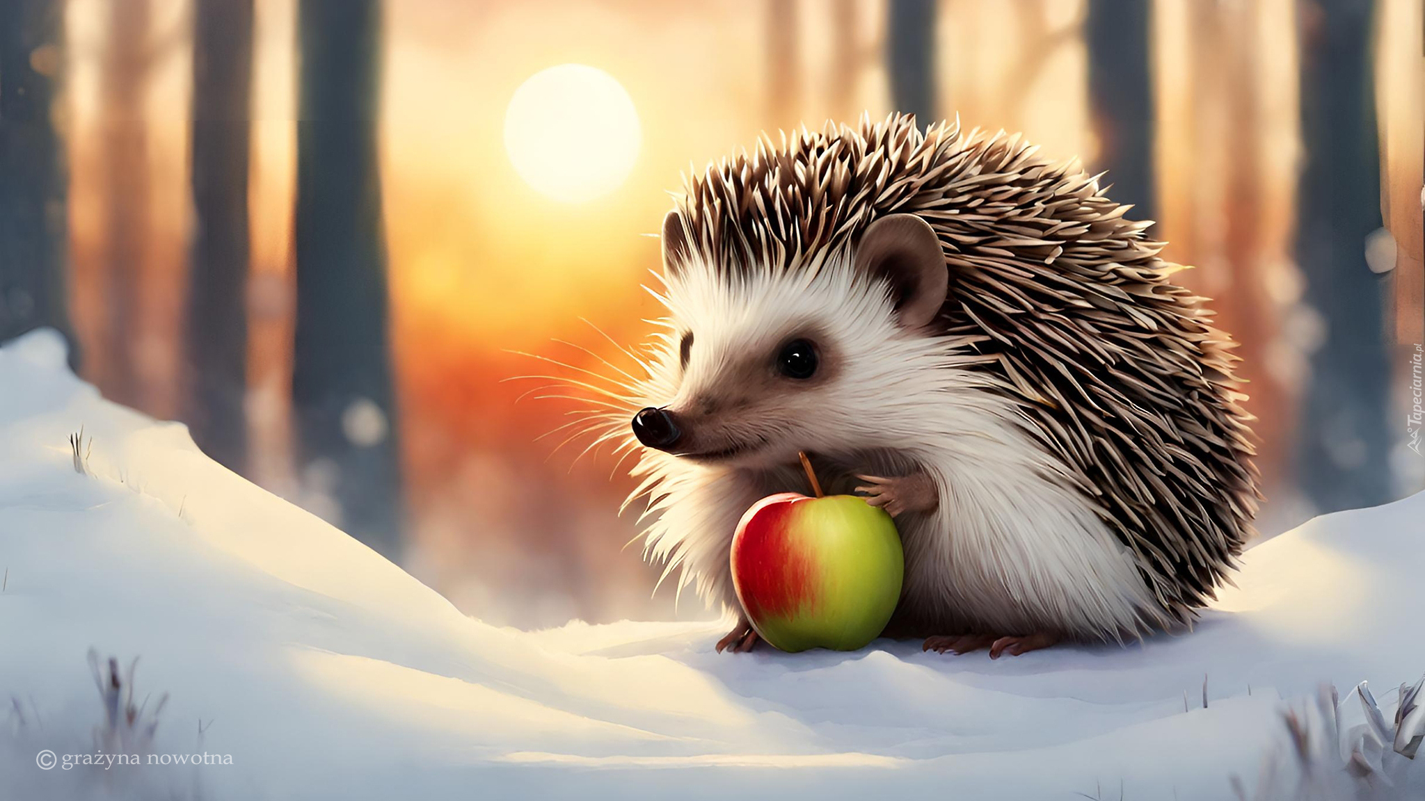 Edytor tapety: Jeż z jabłkiem na śniegu