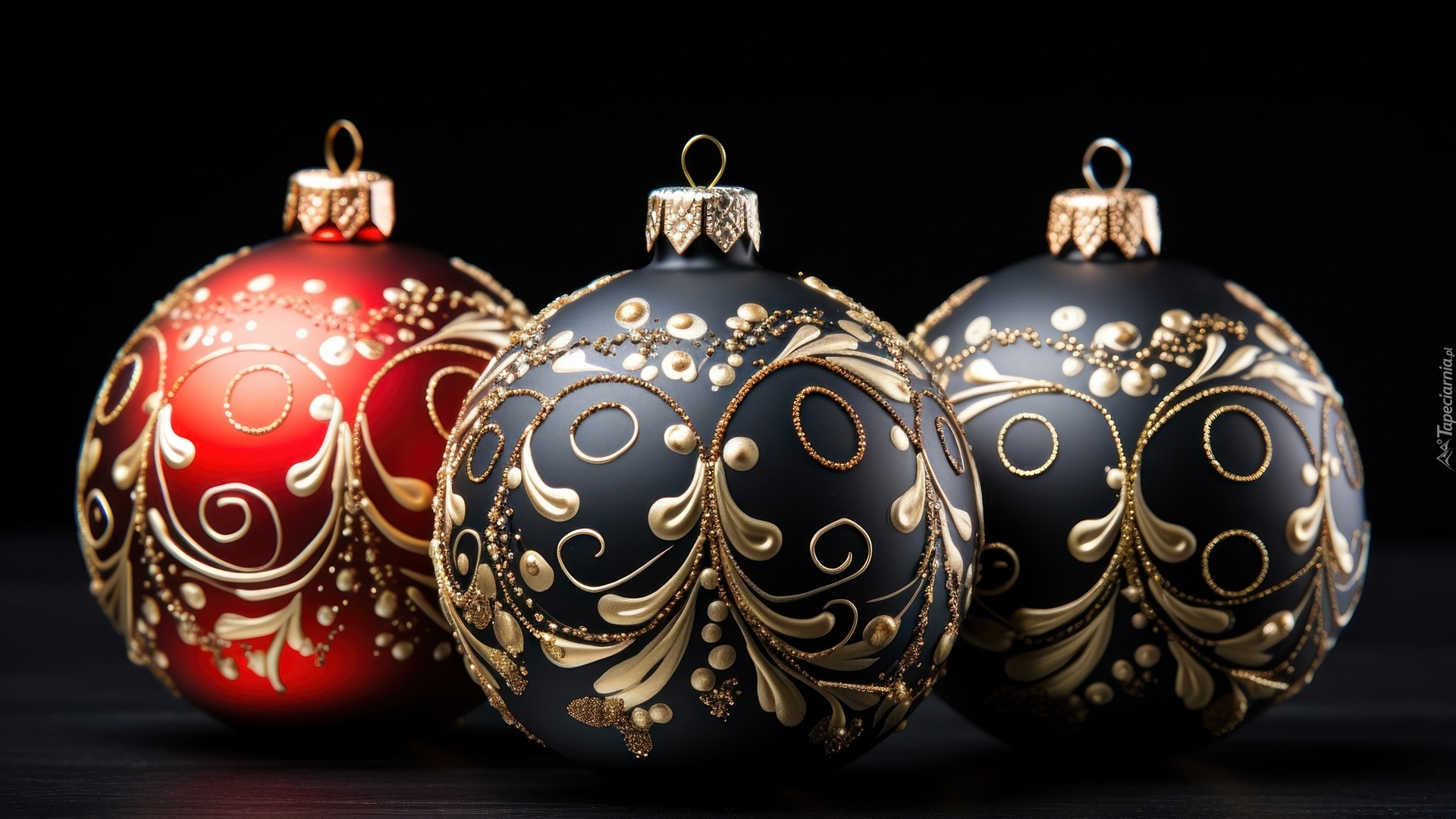 Edytor tapety: Trzy ozdobne bombki na czarnym tle