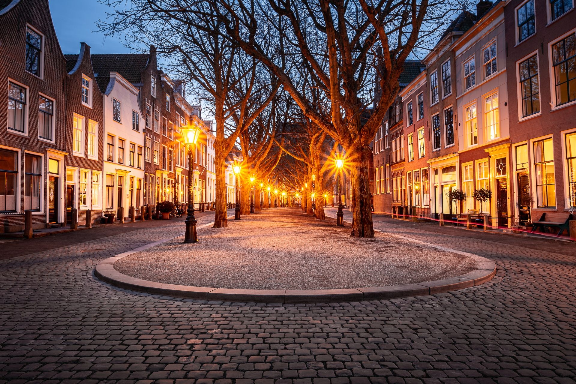 Edytor tapety: Oświetlona latarniami ulica w holenderskim mieście Leiden