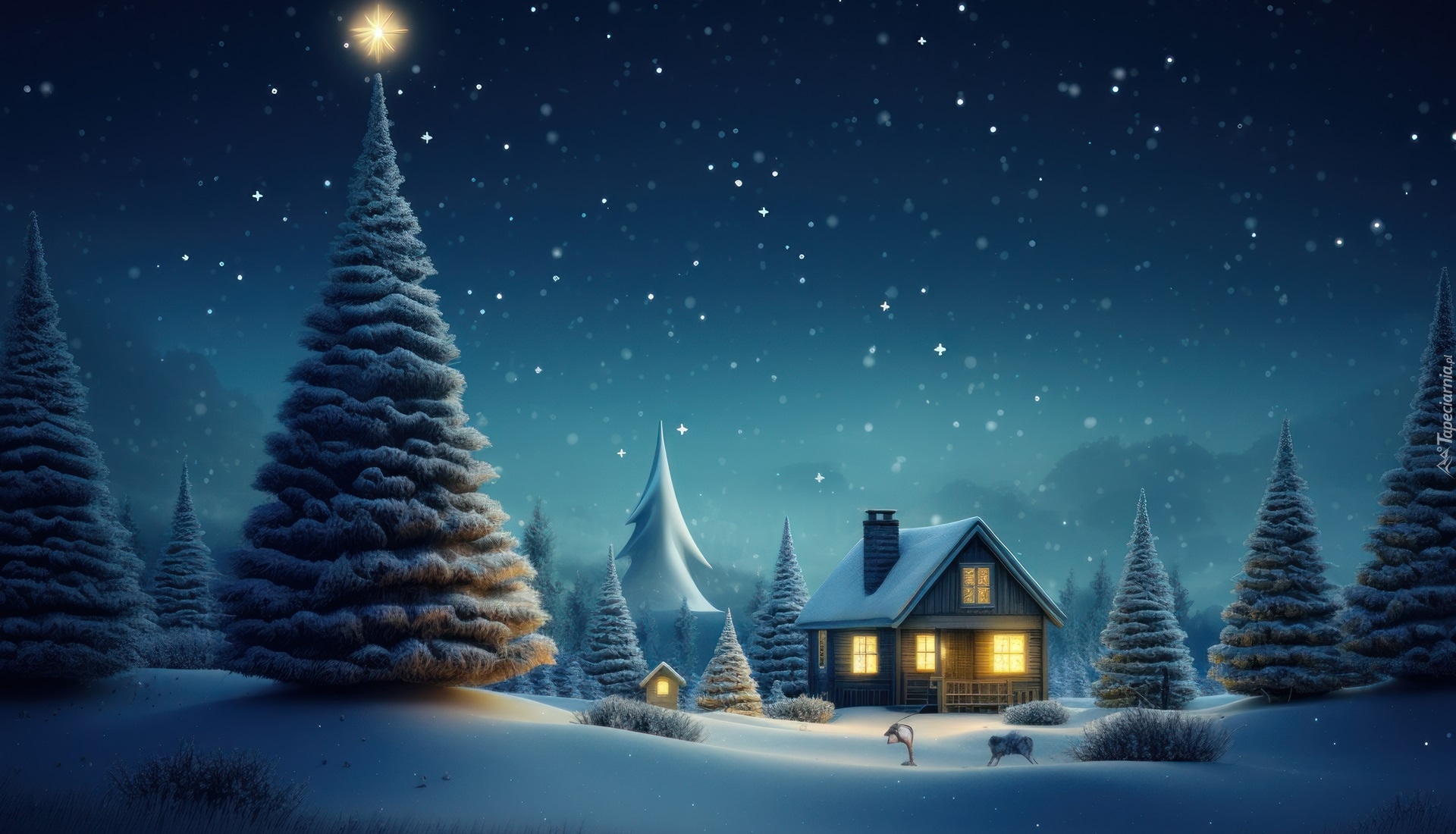 Edytor tapety: Gwiaździste niebo nad drewnianą chatką w lesie