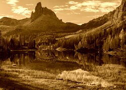 Edytor tapety: Pożółkłe drzewa i trawa nad jeziorem Lago Federa z widokiem na Dolomity w oddali