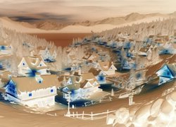 Edytor tapety: Oświetlone nocą domy w górskiej dolinie zimową porą