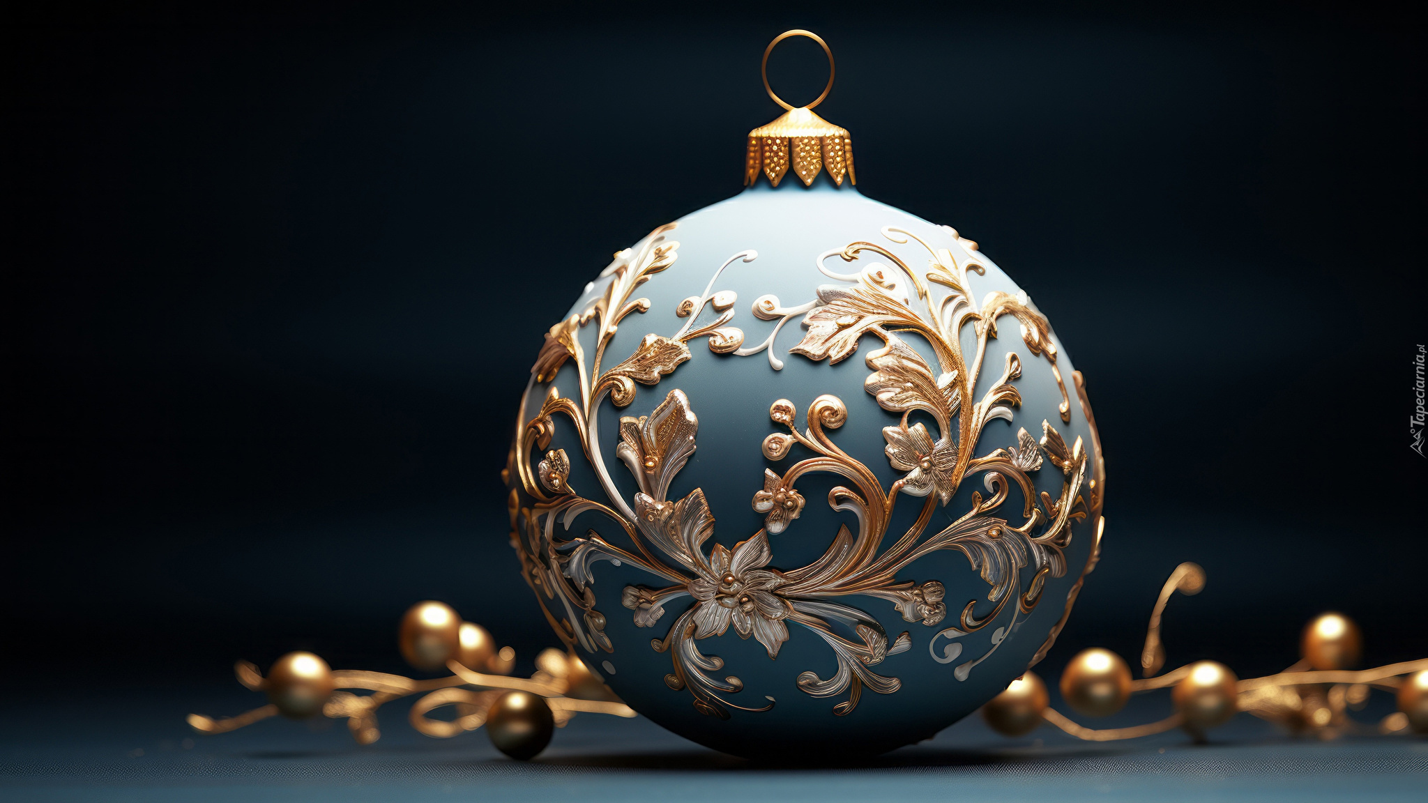 Edytor tapety: Ozdobna bombka obok złotych kulek na ciemnym tle