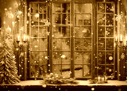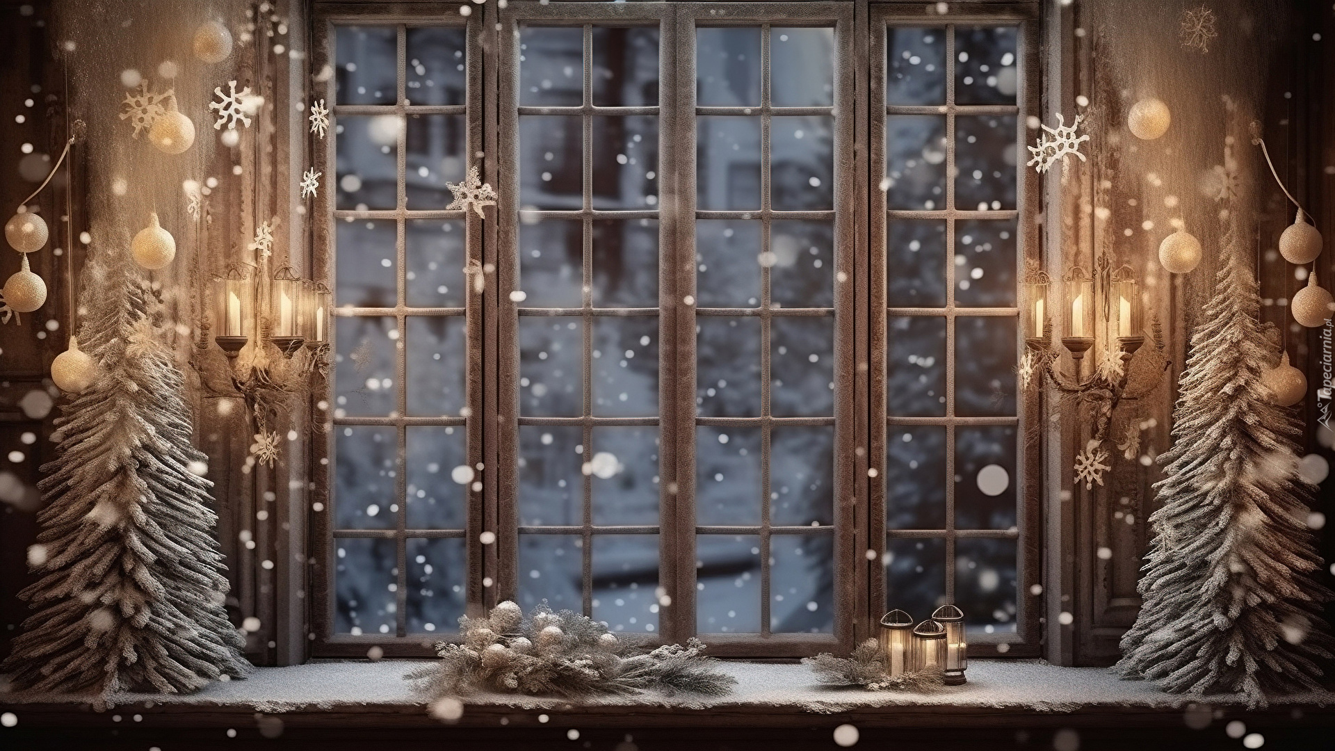 Edytor tapety: Świeczniki i choinki na parapecie okna