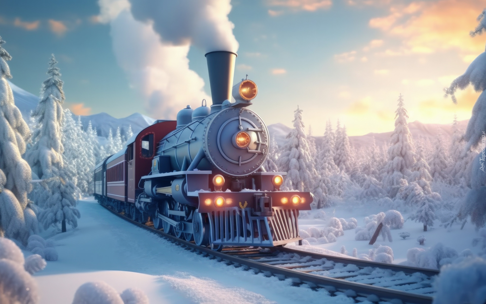 Edytor tapety: Pociąg parowy w zimowym lesie