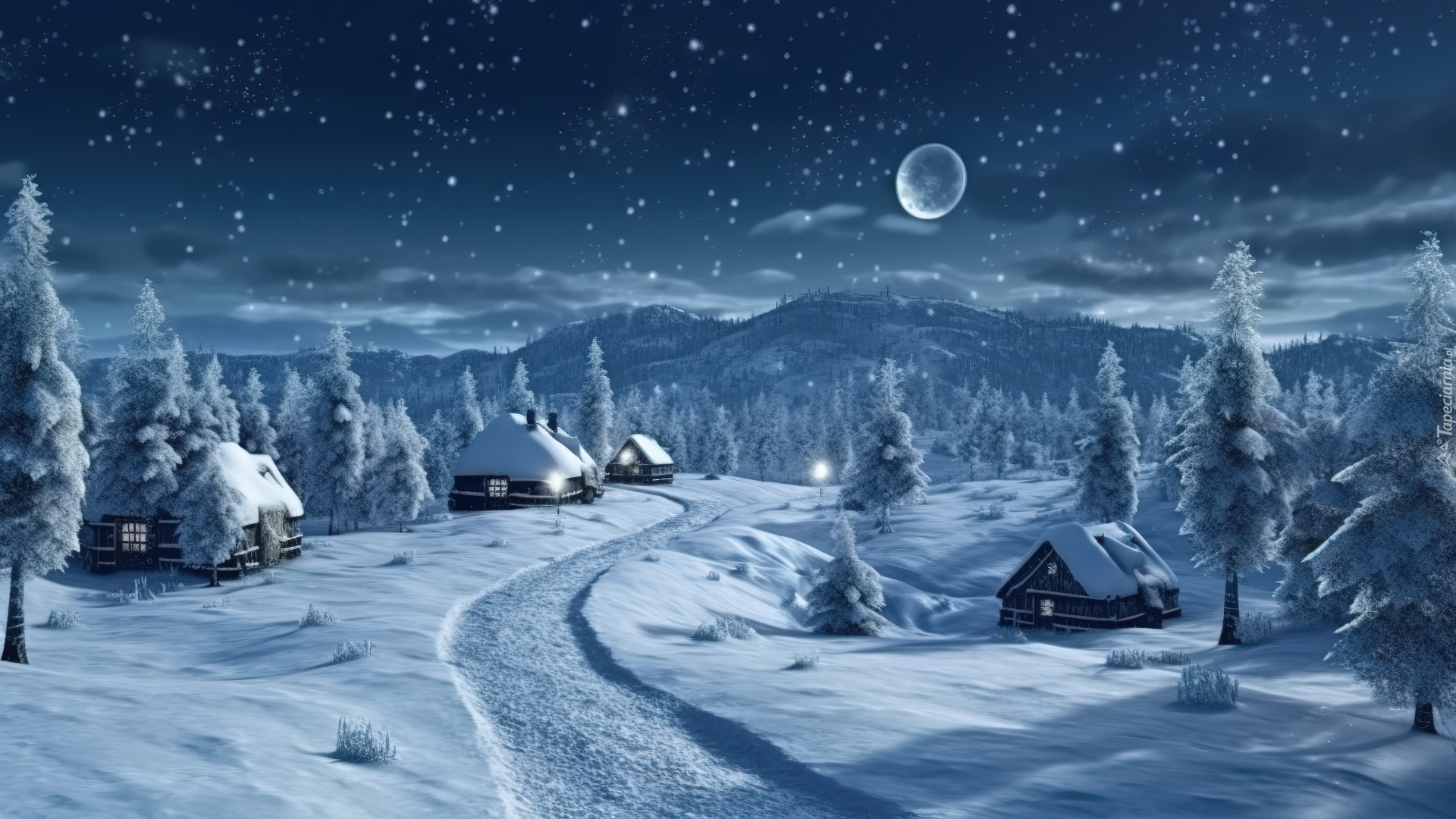 Edytor tapety: Gwiaździste niebo nad ośnieżonymi domkami
