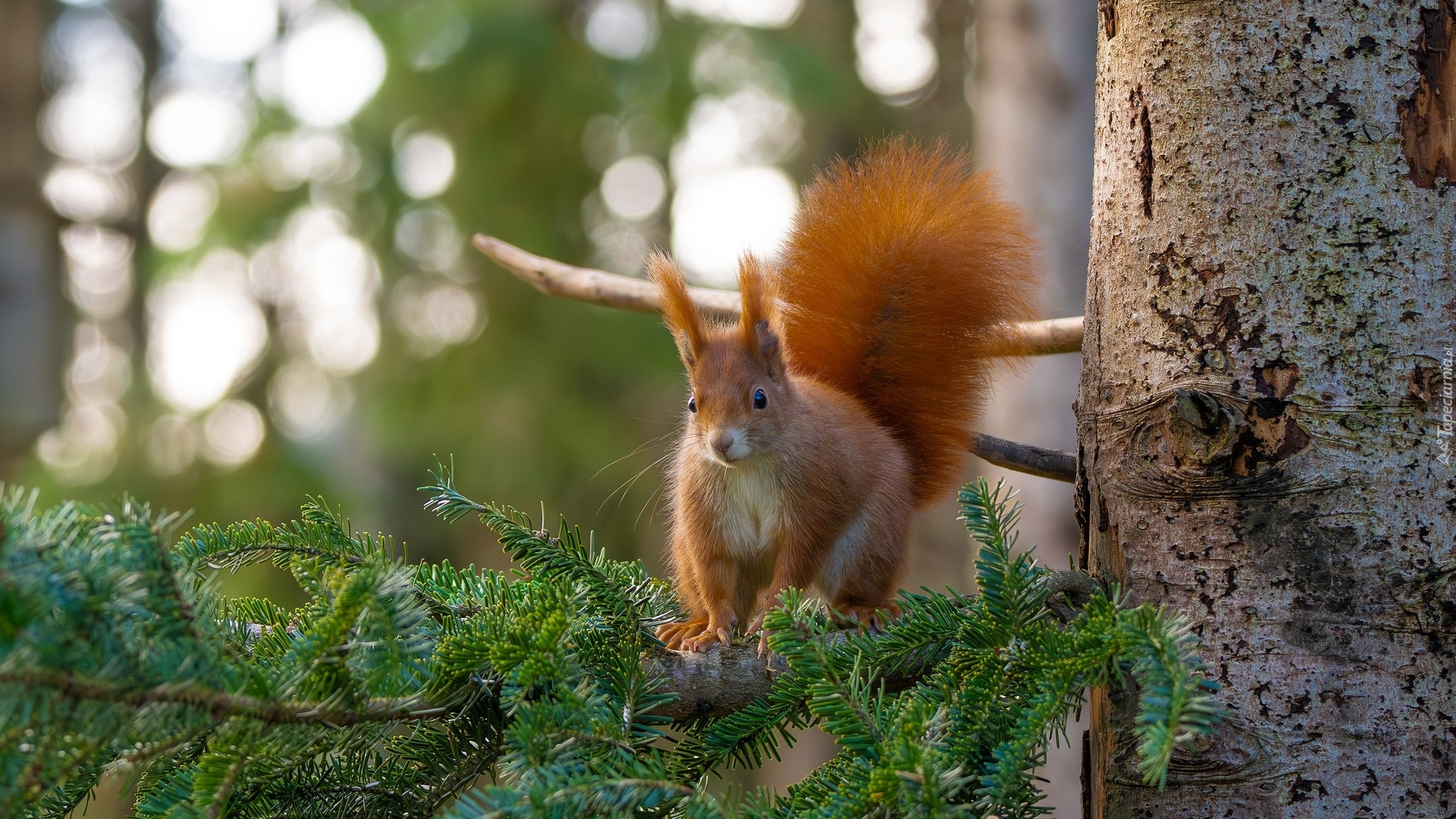 Edytor tapety: Wiewiórka na świerkowej gałązce