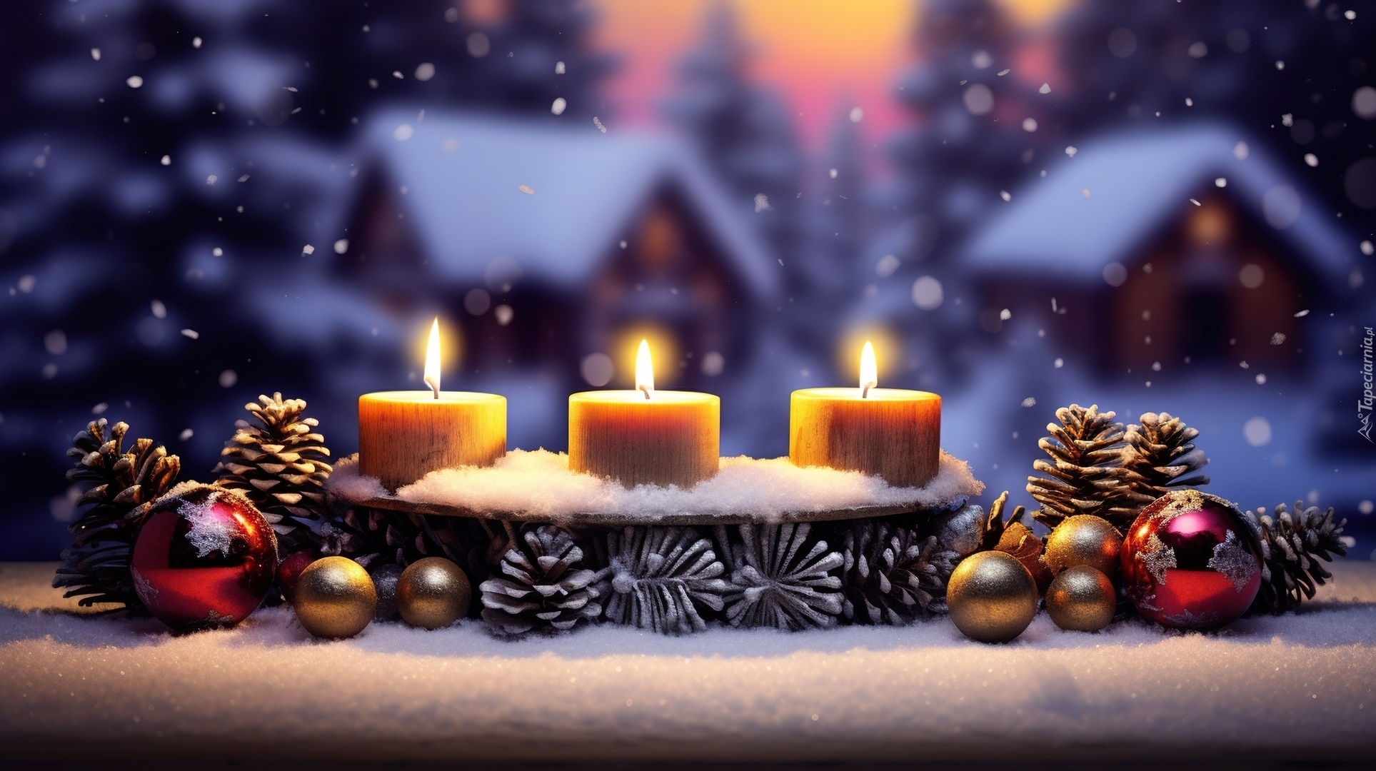 Edytor tapety: Bombki i szyszki obok trzech świec na śniegu