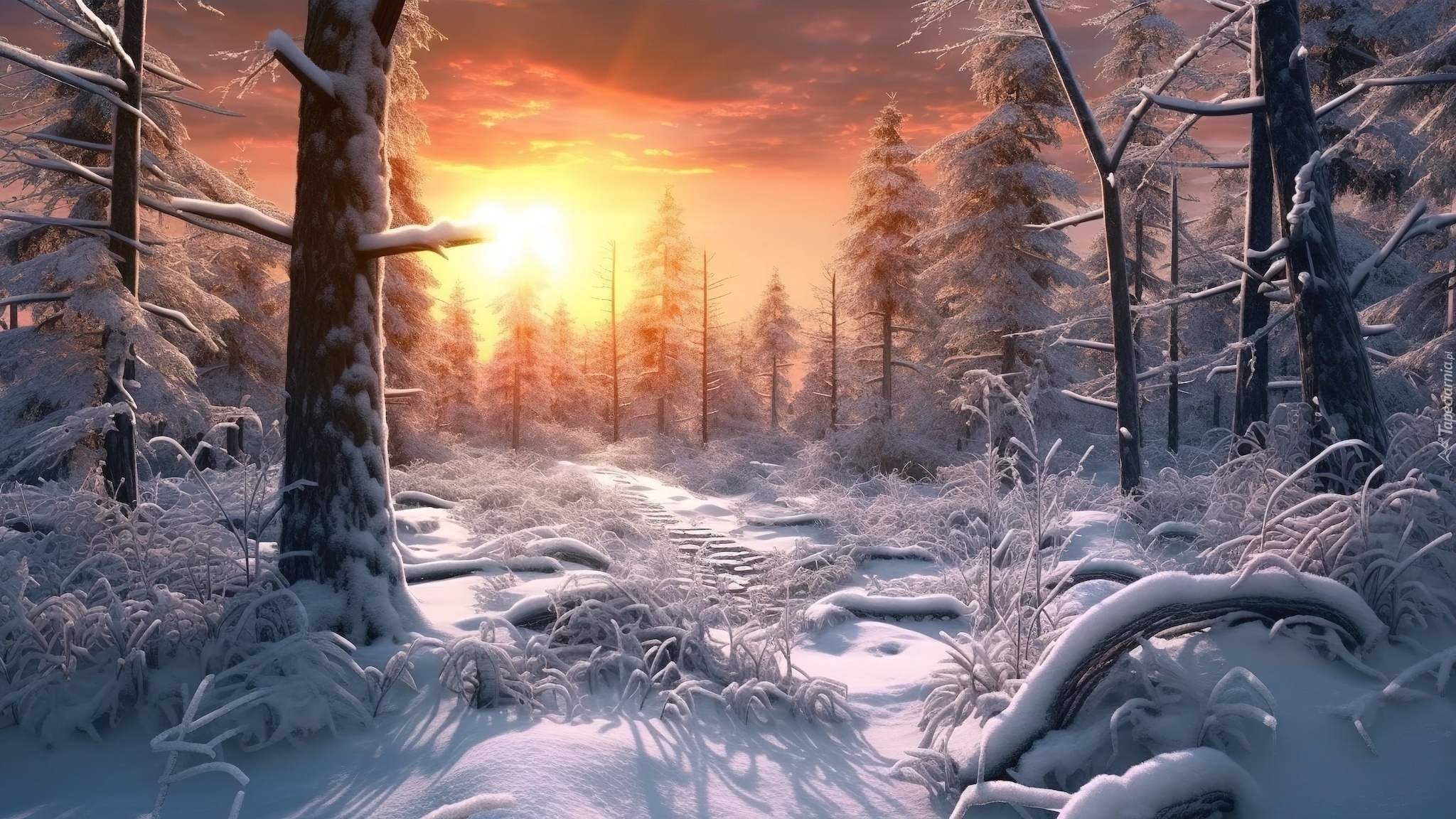 Edytor tapety: Zaśnieżony las w słonecznym blasku
