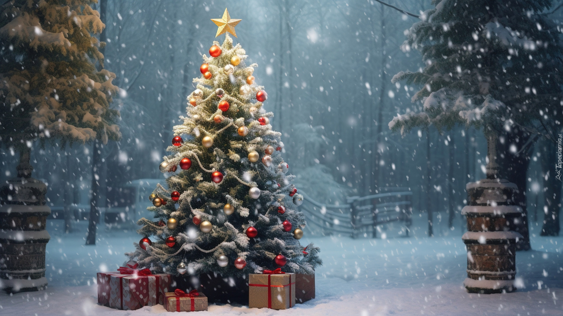 Edytor tapety: Prezenty pod udekorowaną choinką w lesie