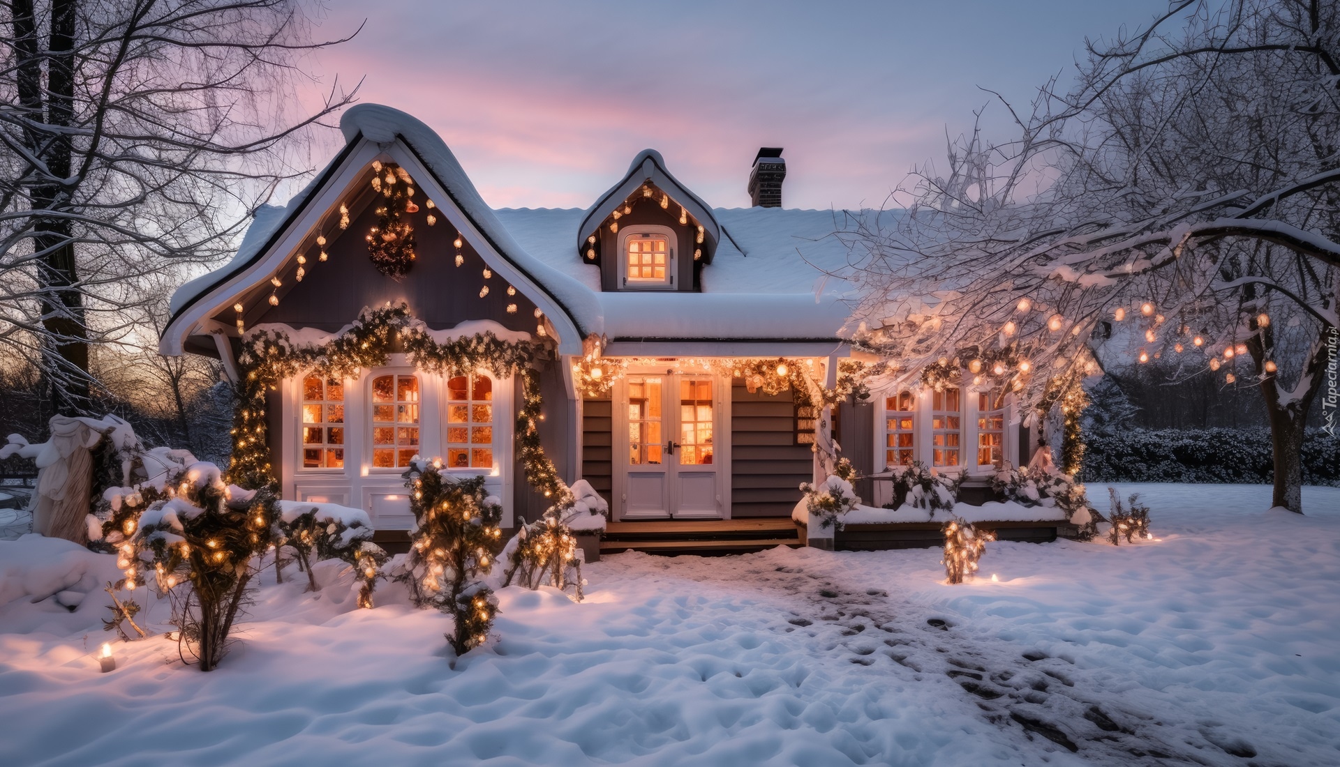 Edytor tapety: Dom i drzewa oświetlone lampkami