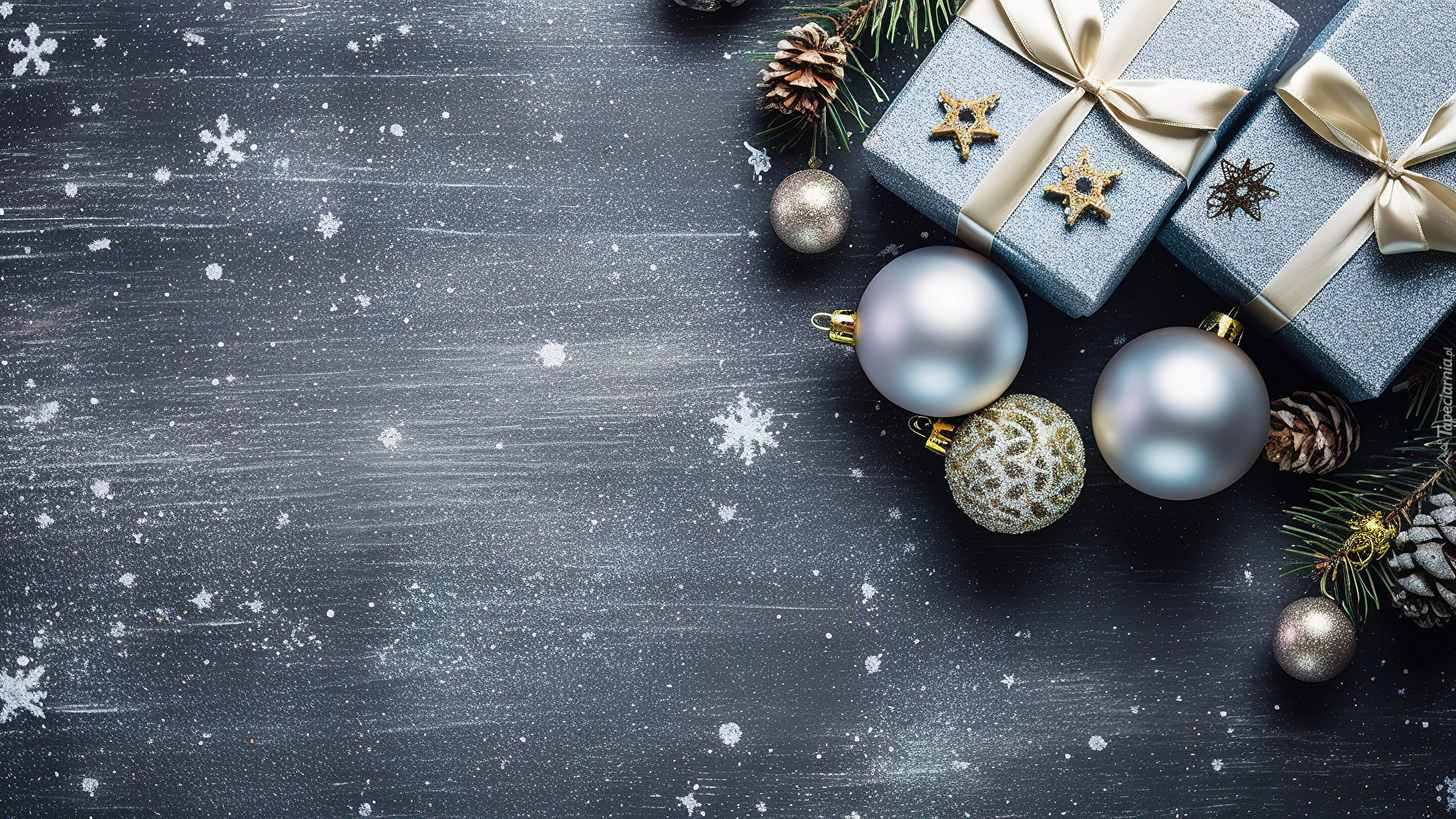 Edytor tapety: Dwa pudełka z prezentami obok bombek i szyszek