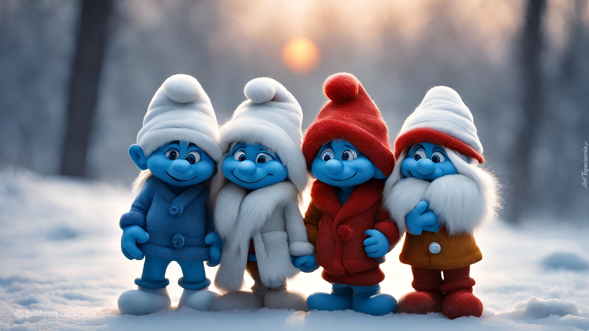 Edytor tapety: Trzy smerfy i smerfetka w zimowym lesie